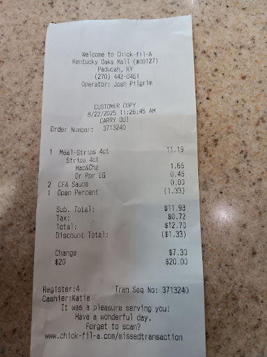Read moreIt’s not a bad place they have really good food! But I do have one problem! Anytime I go to a location of there’s. I ask for my nuggets and fry’s to be cooked just slightly well done.. well they say they can’t do that anymore and that it came from corporate. Well I can tell you we don’t care what corporate has to say. We are the customers providing business to Chick-fil-A. I don’t like the way they cook the nuggets. They are slimy and rubbery. Same with the waffle Fry’s. Y’all gotta do something about that. Or this place will become the new McDonalds. When a customer requests that there food be cooked a certain way. That’s the way to do it.. just like when I go out to eat to have a steak. They ask me how would I like it cooked (Medium rare) they don’t tell me they can’t cook it that way. If they did they would lose a lot of service. When any company loses service they lose the maximum profit they could be making.. same in the transportation industry. We supply a truck load service to the customer. If the customer requests something or isn’t happy about something and we reject them.. Simply the customer could just reject the load at that time. Or terminate the contract that’s connected between the customer and the carrier. At that point the customer would find new carriers to work with. That’s just the way it works. SORRY BUT FIX YOUR...