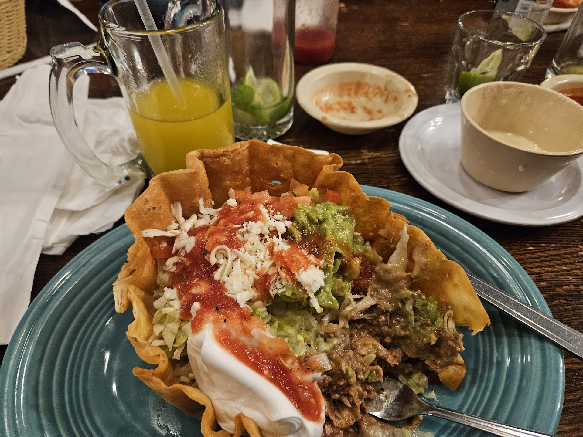 Read moreI had a taco salad with beef, and it was pretty good; the shell / bowl was nice and crispy. Their salsa is watery but still spicy. The chips tasted stale/chewy, but the queso was really good and made the chips palatable. The standard frozen margarita was not good. I had asked for several limes, but even after squeezing them into my drink, I still couldn't taste anything. I should have sent it back, but I wasn't sure how long it would be before we saw our waitress again. My second drink (with my meal) was their frozen mango margarita. It was quite a bit better... it had flavor. We waited almost an hour to place our food order, but it arrived nice and hot. Thank goodness for the free chips while we waited! In all fairness, they were really busy, but they had plenty of staff for a Friday night. Unfortunately, several of the staff members were just standing around talking and causing all of the work to be done by a couple of nice young ladies who seemed overwhelmed. The atmosphere was just ok... the chairs are hard, and the authenticity is lacking. I doubt I return in the future ... as long as there are other Mexican food choices around town. IMO, La Luna has way better food and drinks. Heck, I'll give Taco Bell 5 stars over this place. Too bad you can't get margaritas...