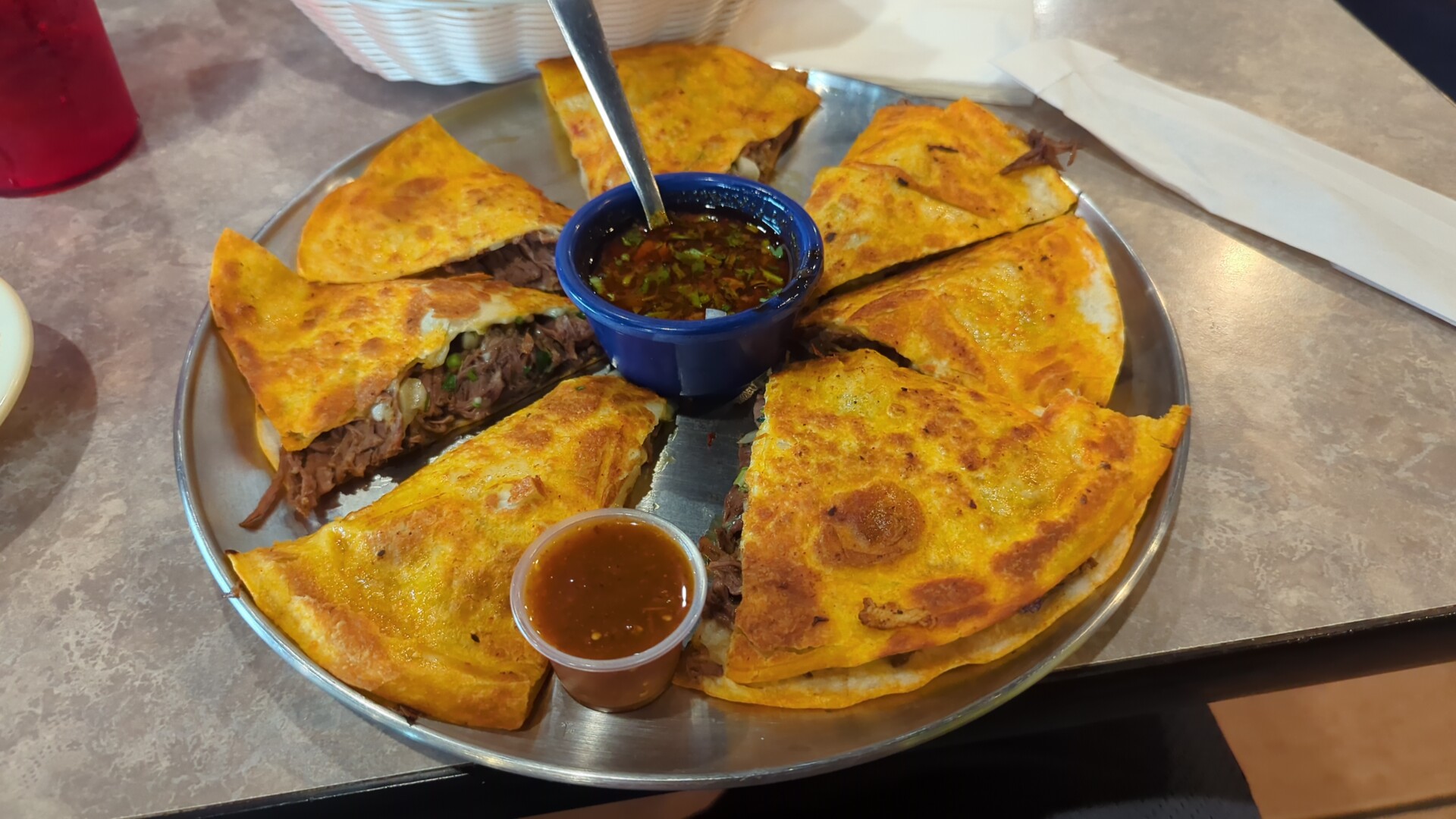 I had the Birria Pizza. Not your typical Birria, this is served more like quesadilla birria but with a hot sauce that can be mixed into the broth. My only complaint was the higher than usual amount of fat on the meat. This looks like too much, they also have Birria Street Tacos although I did not opt to try those.
