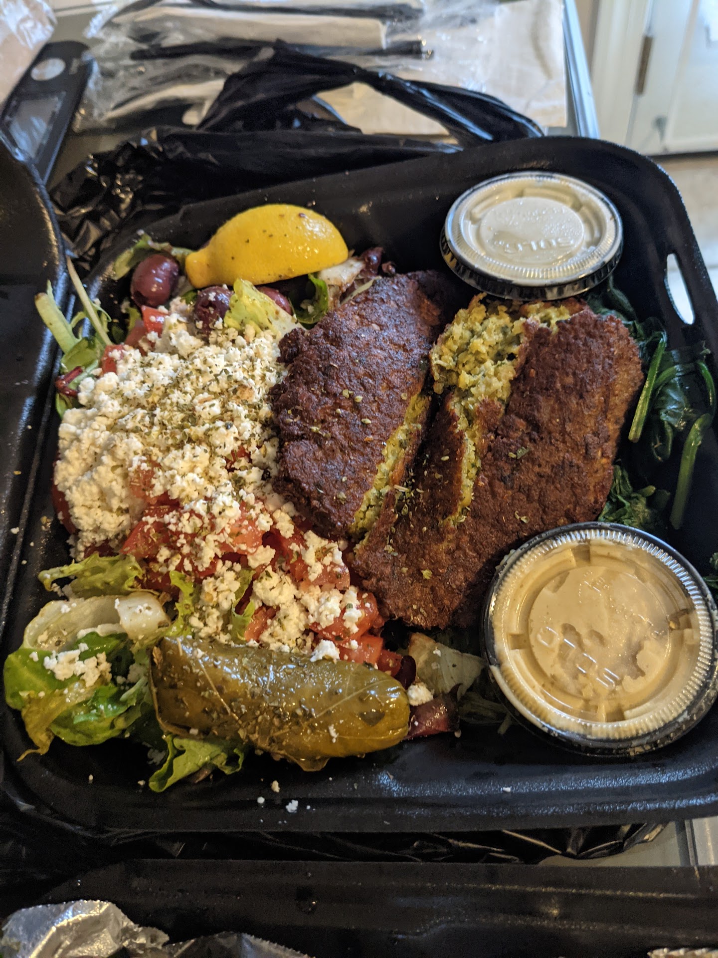 We looked through the menu and found a lot of tasty meat options, however, not too many veggie/vegan entree options for my brother. We explained my brother is vegan and they said they were able to accommodate by providing a falafel entree option, Luckily, my brother loves falafel. We asked to substitute tzatziki for hummus (so it's vegan). Thought we explained that he was vegan, we noticed his entree still had feta cheese over his salad. We didn't make a big deal of it; my brother just took off the top layer of his salad (though other vegans might be more strict about this).