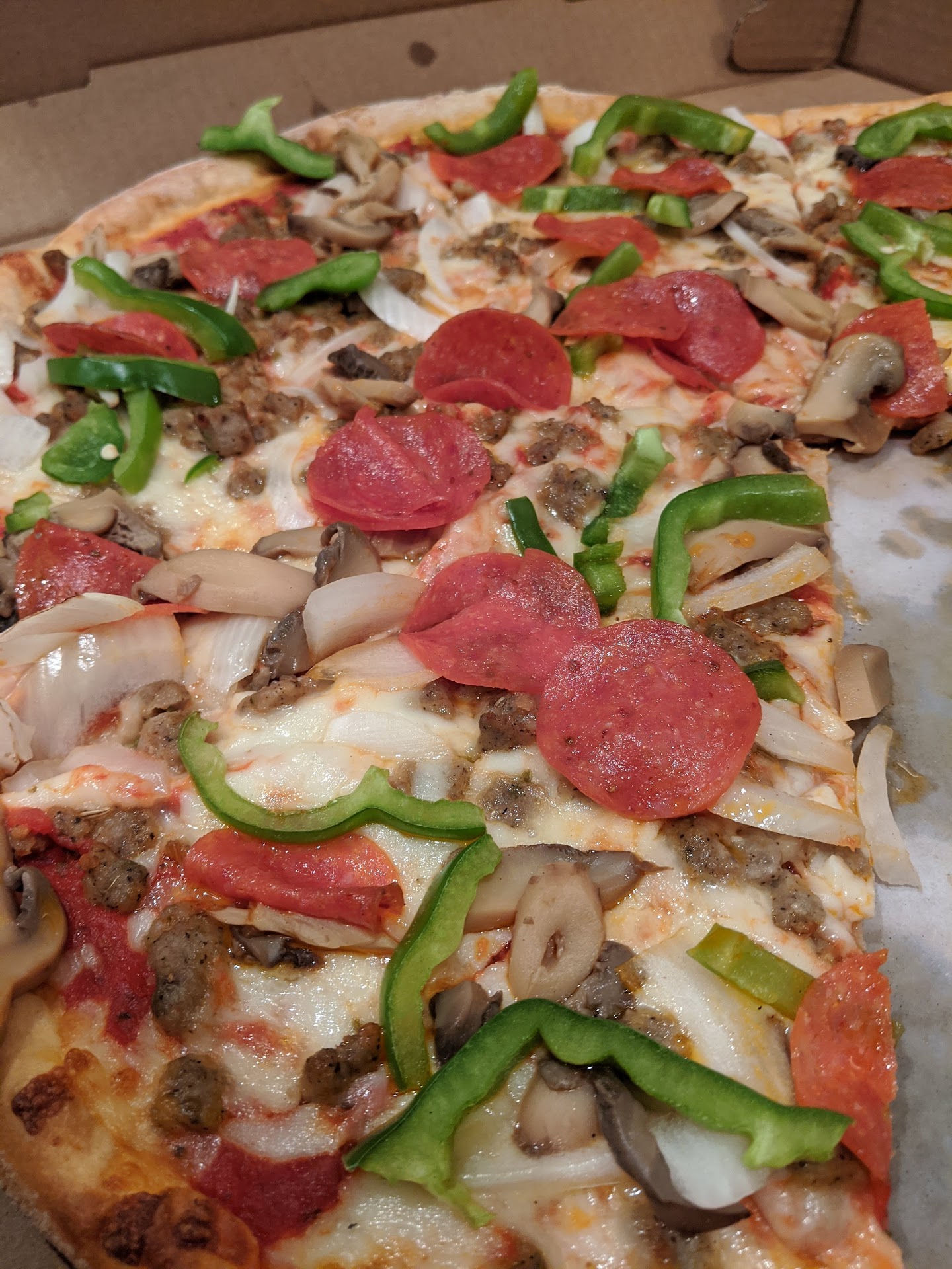 As for the pizza, our "the works" was obviously a cheese pie with ingredients added on after the fact. Pale red pepperonis and still-crunchy bell peppers were a particularly frustrating sight and required the whole pie to go under the broiler for several minutes, at which point the cheese and crust were pushed into the well-done range. Ordering takeout shouldn't necessitate playing chef again once you get home.