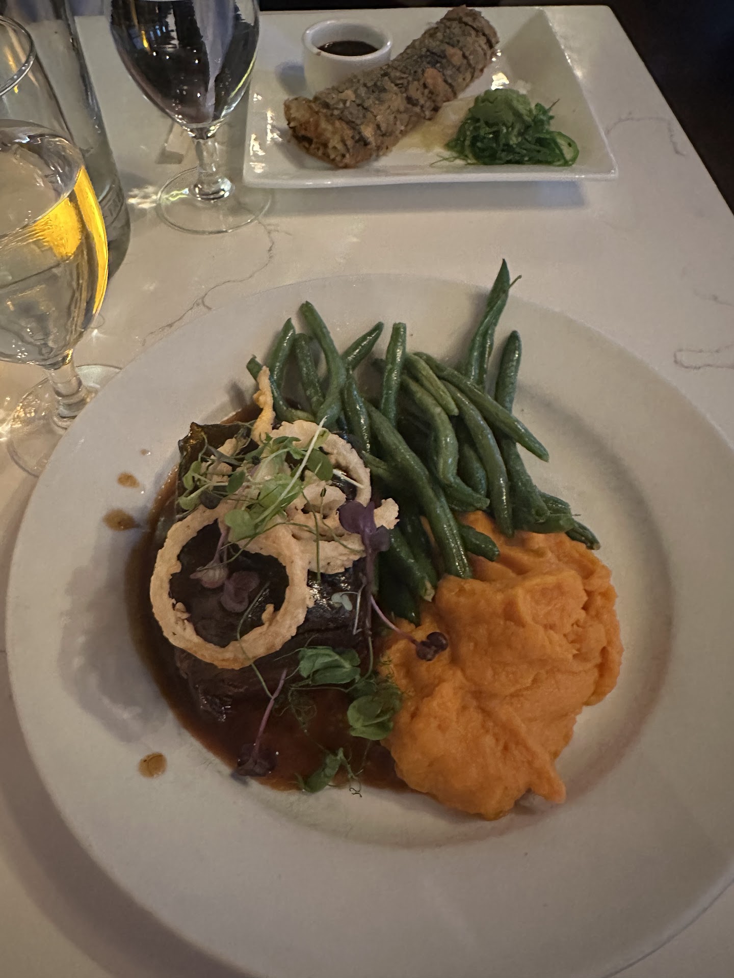My dinner, Braised Short Ribs, had a nice thick slab of short rib with the requisite gravy (needed more). The sautéed green beans needed more time in the pan as they were barely cooked through. My wife ordered the Spicy Tuna Roll which was prepared with a breading of panko and then deep-fried. This method caused the minced tuna on the end pieces to become hard and inedible. The tuna in the interior pieces had congealed a bit, making the texture a bit strange. The taste was OK, but we decided to take it home to see if it could be salvaged. (No.)