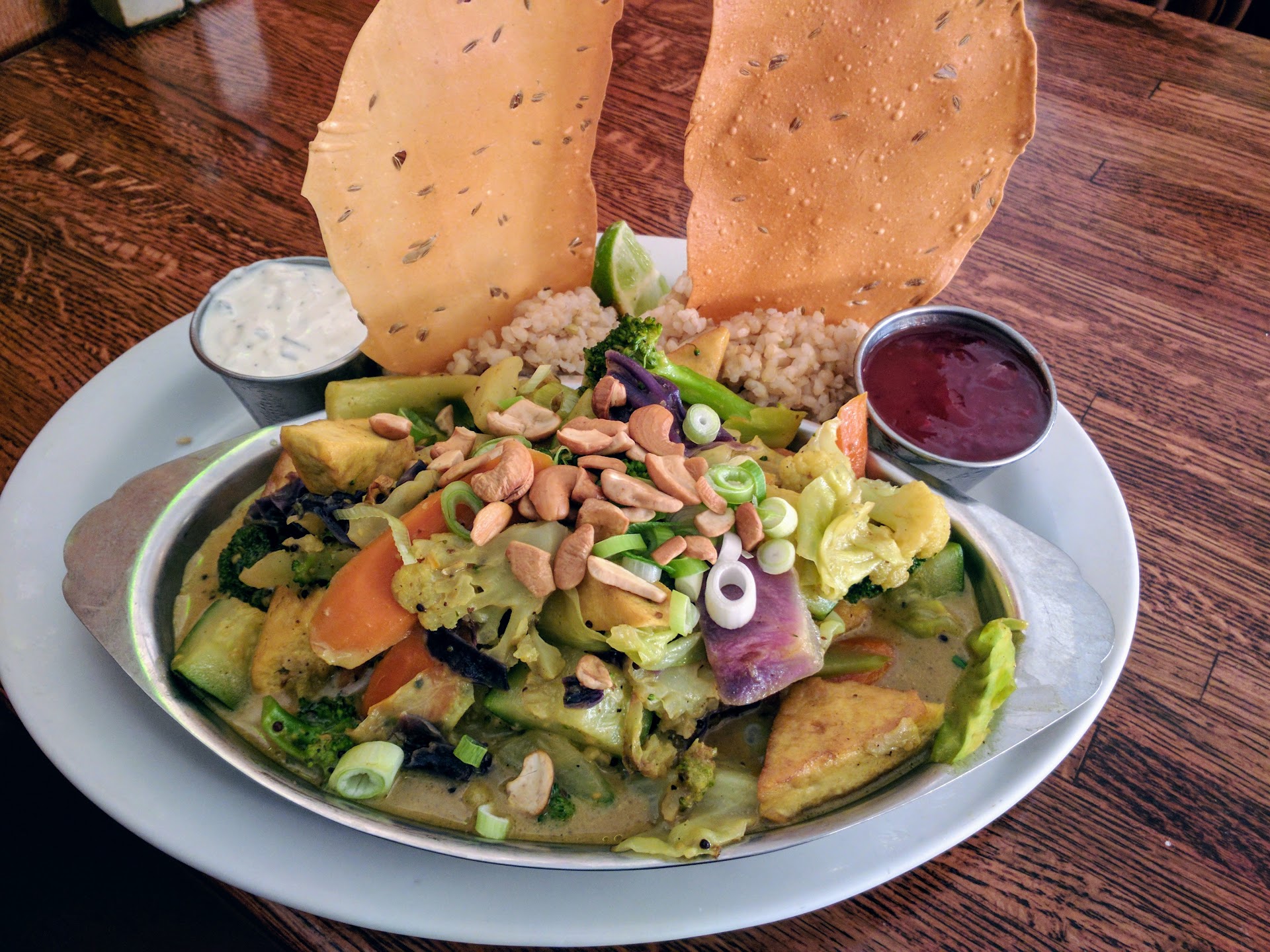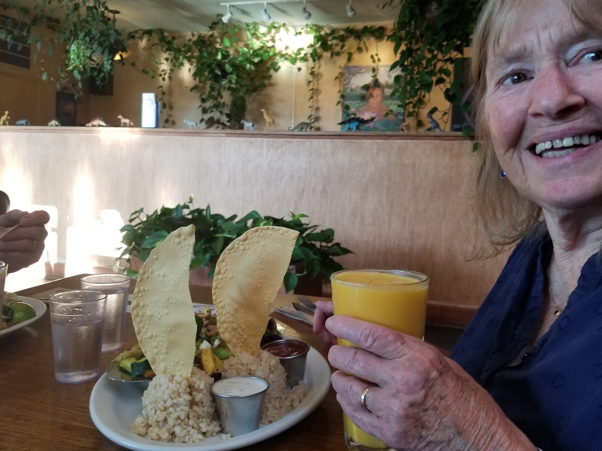 Very healthy good food. if you're not used to it, some dishes can seem a bit bland. huge servings with prices to match. don't order soup and an entree; the soup showed up in the size bowl i might make a cake or cookies in. it would have been nice if the person at the register had taken note that one person was ordering food for ten and warned me. i took the soup home and cooked some excellent mixed variety rice with it, adding a little bit of something , e.g., red curry sauce, cashews, chicken, etc., each day. at the restaurant, i ate maybe one-sixth of the beautifully presented and toothsome entree, but had some trouble getting a big enough container for the soup, and had to use two take away boxes over filled to accommodate the leftover entree. my companion's vegan gluten-free burger and fries were a more normal serving size. The service is neither good nor bad - there is no service. you order at the register, your name gets called, you pick up your tray, get your own eating utensils, and bus your own table. there is a place on the credit card chit to enter a tip, and a tip jar by the register - i ask you, what is one tipping for? i did of course. somebody needs it if they're asking for it. This was my first visit. I chose Dharma's primarily because my friend is religiously vegan gluten-free and Dharma's was conveniently close by, and secondarily because one of the chefs is a friend and i had never had one of his dishes. My chef friend's dish was vegan healthy etc., very flavorful, a very repeatable choice. Will I return? No. It's too pricey. If someone with means wants to treat me, absolutely. I'll ask my chef friend which dishes have more flavor. I'll bring my own takeaway container. And, there will definitely be an order of fries.