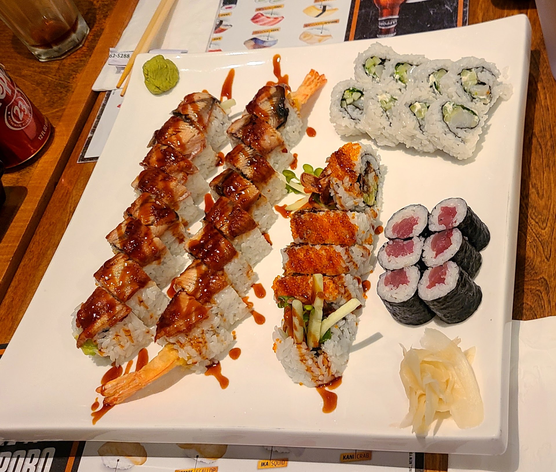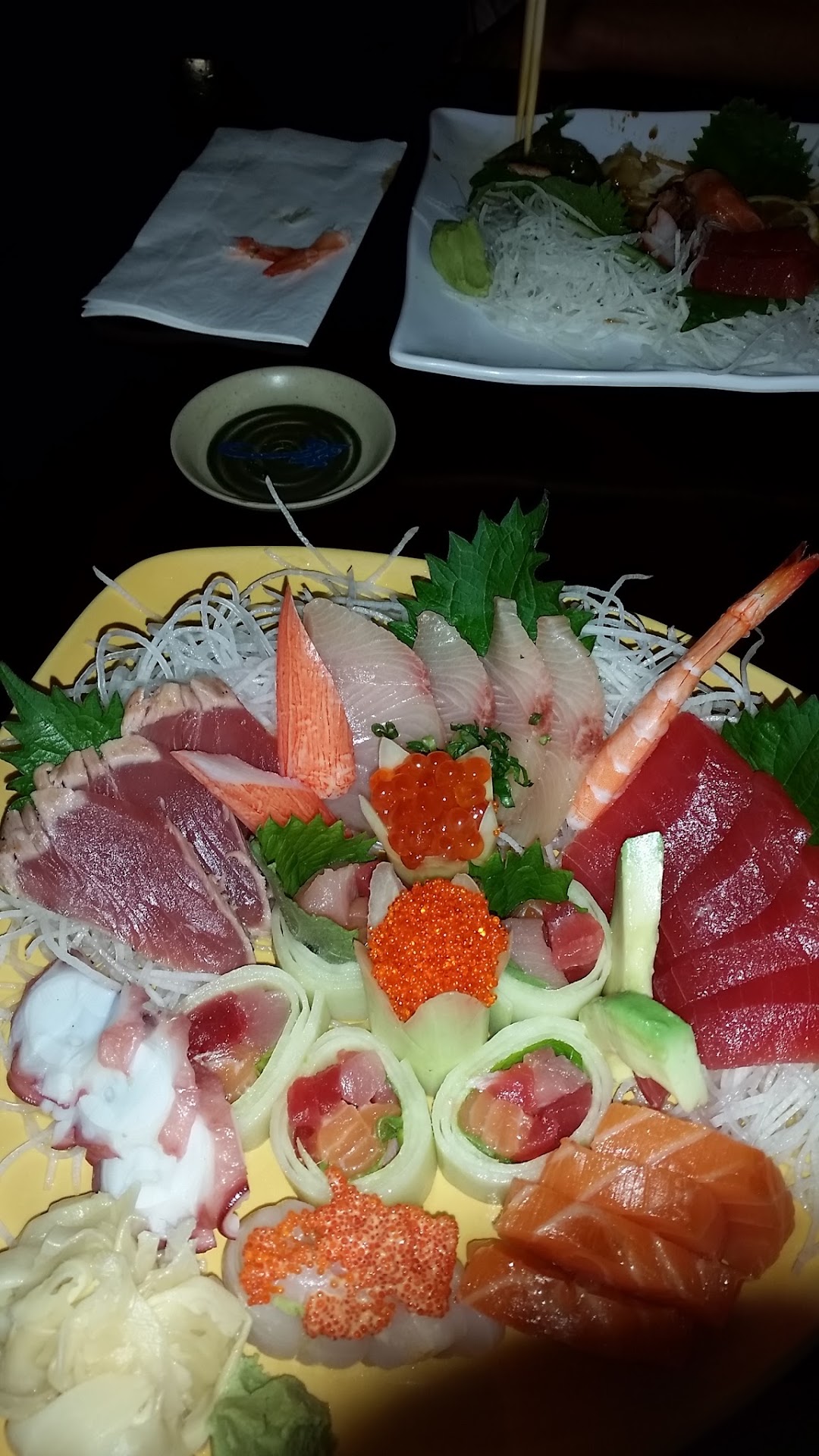 The waiter and waitress were patient and thoughtfull when presented with questions regarding the sushi. Shortly after I anticipated a long wait but to my dismay it was brought swiftly. It was presented beautifully on a gaint planter. Throughout the meal we were checked up multiple times.