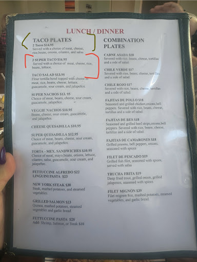 I pointed out another item (which we didn’t get but an interesting observation) - a “soft taco” on the menu is 4.95 and “two regular taco plate” is 14.95 which makes zero sense if it doesn’t have rice and beans on the side and they said it’s also correct no rice and beans on the side, it is 4.60$ more expensive than buying them separate.