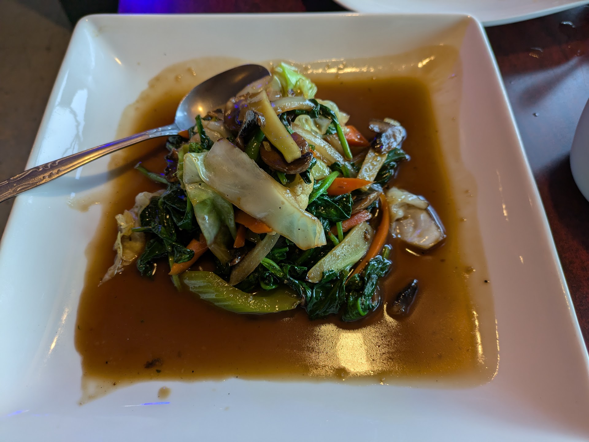 Read moreWe went to this restaurant last Saturday for an early dinner. There were no other people at the restaurant when we arrived. We were not even sure if they were open because the entrance door was closed and there was a huge lock on it. The server brought us water and the menus and wanted to take our order right away. We asked for a few minutes since we were not familiar with their menu. We asked for fresh vegetable rolls to start with and the server just wanted to rush us to order everything we wanted. We asked him what dishes he would recommend for someone who is on a plant based diet? He didn't seem to understand the question and when I elaborated he said that the wok dishes. However, there was nothing marked on the menu about wok or anything else. He seemed to be annoyed when I asked him to show it on the menu and he just "circled" a few with his finger. We ordered a dish and a soup to share. He confirmed it multiple times and switched plates, brought us cups. We got our food which was absolutely delicious. The portions were smaller than in other restaurants and there was no rice on the plate with the vegetables... We ordered one, but he forgot to bring it to us on time... We felt like eating one more dish and wanted to order a basil dish, however they told us that we would have to wait at least 25 minutes because they were busy with takeouts. They literally wanted to convince us not to order more, but leave. They even said no to the desserts and brought us the receipt. We left disappointed and there was nobody to say goodbye to when we exited the place. They should at least communicate their "order policy" better towards...