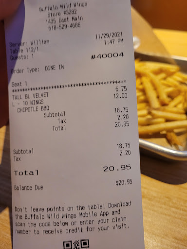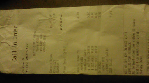 Read moreI ordered my food a little before 10pm I was told it would be ready in 25mins. I called right back to cancel a salad off of my order because the overall price. When I got up there I called first and was told my food is being bagged. I sent someone in to grab my food and was told they thought when I canceled my salad I wanted all my items cancelled so I awaited another 40 mins. Which I then asked for a discount because I had my child in the car with me waiting. I then get my food and I was charged for 3 blue cheese, when ordered over 30 pieces of chicken. Additional ranch cups were in the bag. I later on noticed i was still charged for the salad that I never had gotten and also my bone in wings were sauced with the wrong sauce. I should've received my whole $35 back but I was given $15 poor customer service. O couldn't believe the wait and how unprofessional this was. Also the fact that when I called they still told my my food was ready and not accidentally cancelled. I drove from another town so this was very upsetting. To wait a hour for the wrong food and still not have a salad that I paid for. To only be discounted not even half for the prolonged wait after I asked. This is a new receipt because I called around 9 45. With the salad still on this...