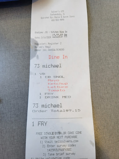 Read moreI gave a good review of the Culvers in Marion, because it was run well and had good food. Twice I have tried to get food at the Carbondale location. The first time I was in line behind a lady who was being waited on, when she was done I stepped up. the worker went to get an ice cream something for her. ...never came back to his station. I waited while many others lined up and got items from the other end. I started to walk away and someone came to close down the register. I told them and asked them why I was left hanging....they said I can get in the other line...I left. So now today....I saw the commercial for the custard and said why not give them another shot....but alas, I walked in wearing my bright red shirt and yet as I approached the only register open, the kid walked away to check on something....I waited... he came back, but not for me to talk to someone in the kitchen named John, ...I was thinking "wrong John". so still I waited as they talked.... A family came in and the small group "none of them wearing red like me( so bright and noticeable) , but the kid stepped right up to wait on them, I cleared my throat and as he glance over from them to me ... ..I raised my hands and was about ready to call him on his lack of attention so he asked if I wanted something....duh! .... I said well I have been here for awhile, it looks like you want to wait on them first....so why don't you just do that and I will take walk....so again I left without my custard ...and no, with so many restaurants trying to make it in Carbondale....I will not be back....and for all Culvers well unless I am shopping in Marion.... because let's face it...the food is great and probably so is...