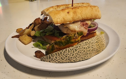 The Chicken Cordon Blu was very tasty with lettuce and thick sliced tomato and onion. Home potatoes and sliced pineapple and cantaloupe added for desert.