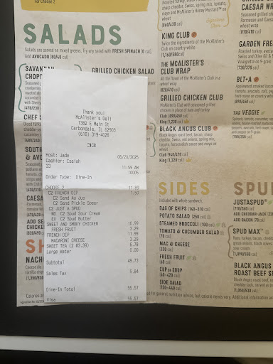 As you can see the receipt shows some problems with this restaurant. We talked to the cashier during the order and she said that the orders were all good. Once we got the receipt the price was different and the order seemed wrong. So we talked to the cashier and she said the price was changed at the first of the year. And we are there June 20th. Yet the menu board and the menu were both different. And we also were told the fresh fruit was not part of the side of the lunch sandwich’s. And you can the price on the menu AND the price of the receipt and on the board were different.. THREE prices We were asked how the lunch was and we told “management” about the order and the price and the “management” said the same thing about the price change. I also told the “manager” that we had been waiting for our lunch for 6 minutes on the order window. It started at the 5 minute mark and my son(17yrs old) went to say something to the window “workers” but they were more concerned about the job hours and pay. And the only reason the food was delivered was because I went back to the front table and said something. And all she was able to help with the problem was a desert. This is an absolute joke of management and shadiness all around. We are from St Louis and went the Carbondale for a sports event and though we were safe for a nice lunch and as we know now we won’t be going to ANY McAlister’s and will give the advice to friends to think about it before you do.. there are too many other...