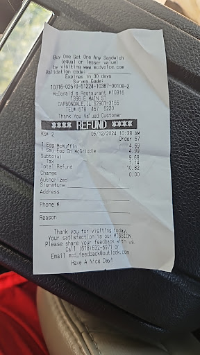 Read moreCan't say nothing good about the place had a doctors appointment at 2:30 got there with my two grandkids about 3:30 they didn't bring me my food buy 4:00 o;clock went to the counter with the receipt told the person at the counter I had not received my food yet they asked to see the receipt the time on the receipt was incorrect it said that I made my order at 2:15 that is not possible because I was at a doctors office at 2:30 in carterville after leaving the doctor's office we went to the McDonald's in Carbondale and it was around 3:30 but I placed my orderafter seeing the time the lady refused to give me my food and said I had already received it and ate it at this point my grandchildren became very upset because they were hungry and had not received any foodthe lady snatch the receipt out of my hand and said she would give the kids their Happy meals but she wasn't giving me my food so that I can eat it again I never received my food in the first place I asked to speak to the who they said her name was Hollybut they said she was not there and would not be there till the next day I am a very unpleased customer this is very sad because I probably will never go back there it is one of the favorite places of my...