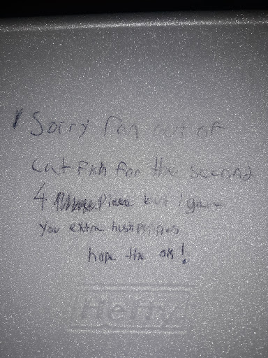 Tonight, I went there pretty late at night. They were closing early, and my heart was broken, but the owner was so kind and offered to make us food anyway. I feel so guilty for making the crew stay late, but Iām kinda glad I did, because I now have a new thing to obsess over: fried catfish!