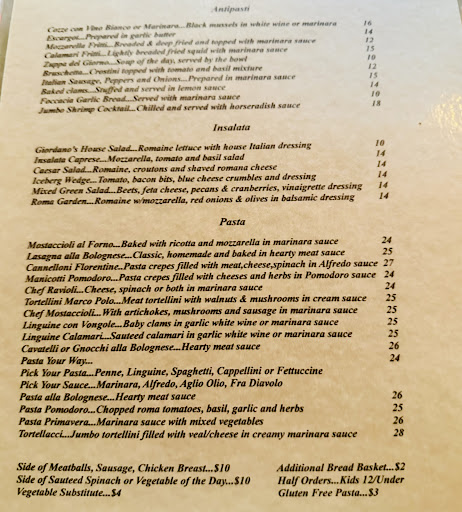 We started with the Caesar salad, which was super fresh and crisp with a nice peppery kick. I had the Giordano with chicken and angel hair pastaâlight but packed with flavorâand my fiancĂ© went with the veal marsala over linguine, which was rich and comforting. We shared a bottle of Montepulciano that was very reasonably priced and paired perfectly with the meal.