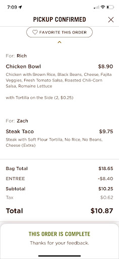 Read moreThis was my second trip here and won't be coming back to the Carlisle location. Walked in to order but evidently you must order online or options are very limited. I planned on ordering three chicken tacos, chicken quesadilla, and a burrito. The girl seemed irritated the moment I told her I didn't place an order online. When I told her I wanted the chicken tacos, she snatched 3 soft wraps before I could tell her I wanted hard shells. I asked for a quesadilla and was told they only do those online, even though I was the only person in the entire restaurant. After some back and forth with another associate she agreed to make it after letting me know next time they won't do unless its online. They didn't have fajita veggies for line or online orders for quesadillas. Should point out there were at least four other people "working" that could have helped with the order didn't nothing but stand around. After twenty minutes I still didn't place my order for the burrito so I just asked for whatever I could get that wouldn't take another 20 minutes and settled for a soggy salad. As I'm checking out, someone who I'm assuming was another manager came in and low key berated two other employees from the dining area about what time they came in for their shift. Kind of seemed like a conversation that should have been held in the back, away for customers. Only bright side of the ordeal was that I didn't spend my own money on the order (gift cards). I would have placed my order online but wanting to use the gift cards, adding them online would have taken at least four hours for them to be accessible. Disappointing on the service side, the food, other than the quesadilla, was cold, and the online ordering has way too many inconveniences. The first time I ordered for this location was about a year ago and I ordered online. My wife went to pick up the food at the time the order was to be ready and she had to wait another twenty minutes despite no other customers being in there. Should have trusted my judgment and ordered...