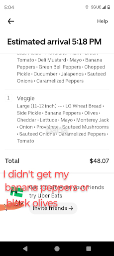 Read moreFirehouse subs Carlisle PA: Using Firehouse subs website and selecting Uber eats as the delivery method, I ordered a veggie sub with added banana peppers and black olives (Along with a second ham sub ). Uber delivered my order and upon getting ready to eat it, it did not have the banana peppers or black olives. I called the store and spoke to the manager James. He told me that because it was ordered through uber eats I had to take the issue up with them (Please note again, I did not order it through Uber eats, I ordered it through firehouse's website and selected Uber as the delivery method). I then called Uber who said the restaurant is responsible for the orders placed Uber is only responsible for the delivery. I would tend to agree with Uber as they have nothing to do with placing the order or making the sandwich so Firehouse messed it up. James the manager did offer to make another sub and send it out but I humbly declined. What I didn't like is that the store tried to put an ordering and making issue on Uber as their responsibility, nor were they able to issue any kind of refund because (as the manager put it) it was ordered through Uber (What I refer to as the classic ping pong effect). Two subs with an Uber delivery was $48. You'd think for that amount they get the Order Right ! No receipt was provided either (usually a store receipt is in or stapled onto the bag). So if you're going to order from Firehouse subs I'd strongly suggest just using their delivery or call the store after you place an Uber delivery to make sure they got your order correct. Disappointed that firehouse blamed a order/making error on the delivery guy. I don't think I'll be ordering from Firehouse...