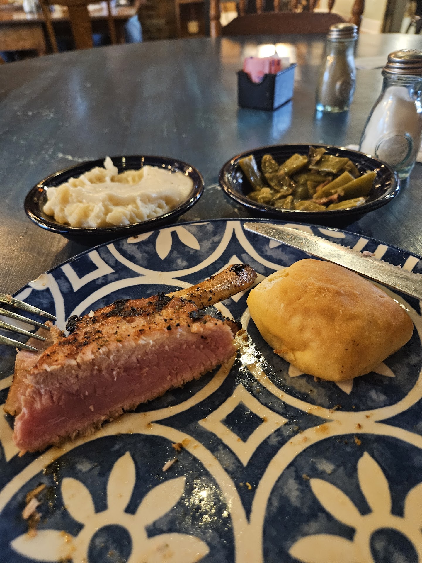 Read moreAbout the best pork chop I've had in quite awhile. Cooked to perfection medium rare, the glaze was YUM!!!! Mashed potatoes and gravy had great taste. Green beans were flavorful and cooked just right. The first pirkchop was over cooked and it was cheerfully taken back, after I received the new pork chop, one of the chefs came to our table to make sure it was OK, it was more than OK. My wife had country fried steak that she loved. Prices were...