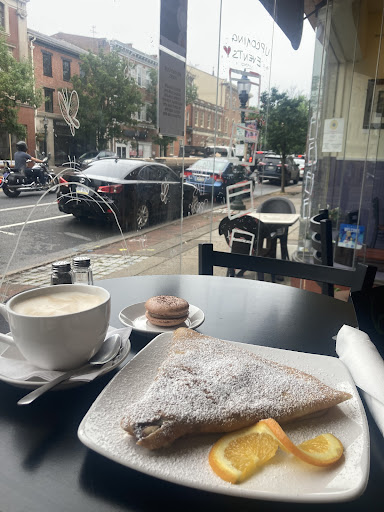 I really wanted to like this cute cafe and I felt confident about it given reviews and it was busy when we came in on a Sunday morning. We were a party of three and all ordered savory crepes, turkey and provelone w/ red pepper mayo, a ham egg and gruyere, and a steak egg and gruyere. We also ordered hot chocolate with whipped cream, and drip coffee for a $30 total. It took about 10 minutes for our crepes to come out and they came out nice and hot and are made of buckwheat so on the thick side. The turkey and provelone was the best and ham egg and cheese second best. I would say avoid the steak and eggs it was horrible bland misc meat and just dry. I had to ask for red pepper mayo to salvage it but was not good waste of almost 9 dollars. The coffee was okay and the hot chocolate was tasty but not hot more lukewarm but I still drank it. Lastly, we decided to give their cake and cookies a try so we ordered the peach vanilla cake and an almond and a Nutella macaroon. The price per macaroon was $2.12 each complete rip off given how small and stale they were. It was very disappointing because they tasted like they had been on display all week. The cake was not dry just not great the frosting was very thick and had hints of peach. I'd say stick to the cheesecake they leave stuff out until it goes away so it's not fresh. Not a bad place not a great place but I get why people come to it as it's one of the few cafes on the mainline and it's close to the college so must attract a lot of students. I'd prob skip them the next time I come or try a sweet crepe instead. Staff was beyond sweet and the review is not a reflection of the exceptional and friendly service...