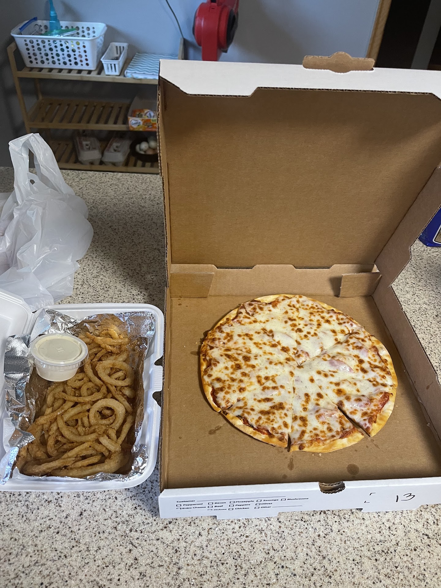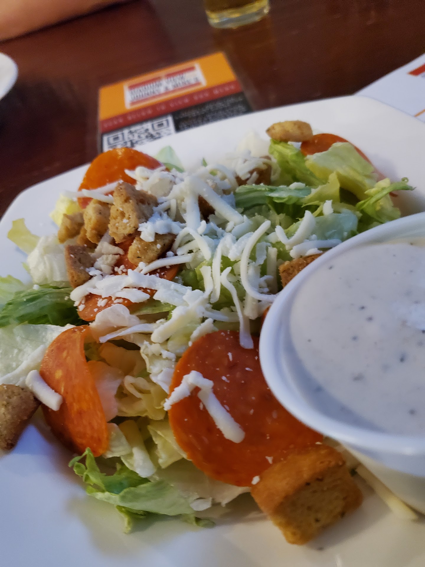 We ordered onion rings, salads, pizza. Creamy parm dressing super yummy. The salads had a few pepperoni added which was a nice touch. Onion rings had good flavor, slightly overcooked for our taste. Pizza excellent! Crispy, thin crust, generous toppings.