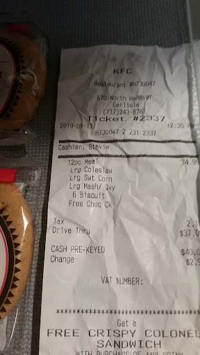 Read moreI do not live in Pennsylvania but I was visiting for car show last month. KFC was the first place I saw and stopped for some chicken. The person who took care of me was extremely helpful I believe his name was dekiha. I loved the service. I went home and just came back this previous weekend for Chrysler car show.. course I wanted some more kfc. It was very busy but the manager ( not the same person I had last time ) was very disrespectful. I was hoping to see dekiha again but sadly I got attitude from what I believe was the store manager. Not a way to welcome a customer into your resturant buddy. Every time I come to carlisle for car show I want to see dekiha not a rude f** store manager. Horrible customer service sir. Also the cashier did not seem to want to take people's orders.