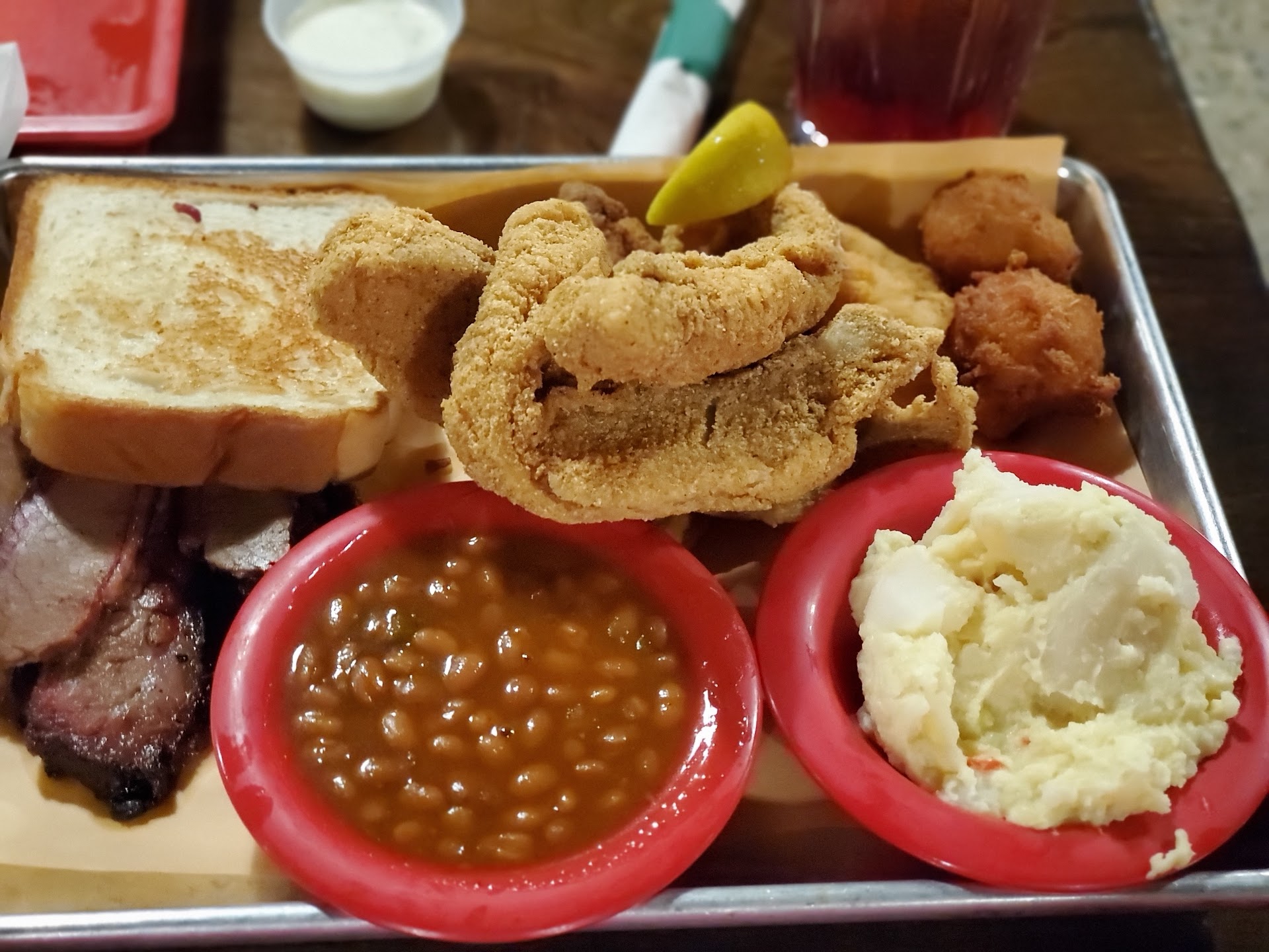 Read moreStopped for lunch while passing through town. Was a little concerned at first because there was no visible hand sanitizer and I watched the waitresses clean off tables but they didn't wipe any of the condiment bottles or the chairs. Ordered our food, between the table we ordered nicks ultimate combo and the catfish,shrimp and BBQ plate. We tried the sliced pork, brisket (lean and fatty, chicken leg quarters) catfish, shrimp, ribs, potato salad, turnip greens, mac and cheese, hush puppies and fried peach pie..they were out of sausage. all of the meats were great! They weren't overly seasoned and didn't require sauce. The catfish was hot and cooked fresh and was fried perfectly. The hush puppies and fried pickles were great. The fried pickles are bread and butter pickles and not the regular sour dill that most restaurants serve. The downside of the visit was the sides, fried pie and fact that they don't serve white meat chicken. I don't eat legs and thighs so unfortunately I couldn't taste the chicken which I was looking forward to. None of the sides were homemade, they were all canned or pre made. The potato salad was horrible for something that the south is famous for. It literally contained potatoes, mustard and mayo. The baked beans were definitely from a can and only had beans. There were no other ingredients like traditional baked beans (onions, bell peppers, ground beef) the turnip greens were decent, but could have used seasoning.They were very bland but after adding salt, pepper and hot sauce they were edible. The fried peach pie left a lot to be desired. There was no sugar and cinnamon as in traditional peach cobbler/pie, it was simply canned peaches and folded pie crust.The mac n cheese was lukewarm and was just basic boxed mac n cheese. The service was good..receiving our food was slow, but the meats made up for the wait. The servers were very friendly and the establishment was fairly clean. The portions are huge and are great for the menu prices. They would do very well to get more flavorful sides to match their meats. I docked two stars because the sides are a major part of the meal but were lacking flavor, but gave an extra star...
