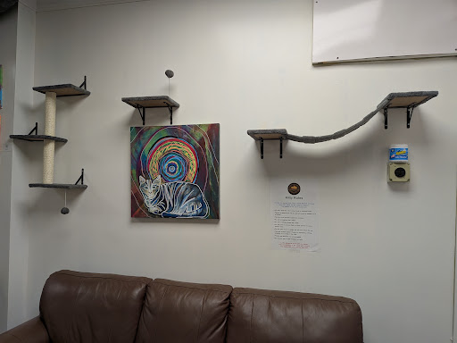 Read moreThis cafe experience has left more to be desired, that's for sure. The kitties within the establishment are very cute, sweet, and delightful to be around as well as the staff. However, the business itself seems to lack respect for the local artists in the area as it has AI art plastered all over the walls. Detrimentally disappointing to see such a thing. AI is incredibly harmful to the art industry and seeing a local business use it is heartbreaking, and frankly, a bit insulting. The cafe isn't very accessible to those who are disabled, either; the second door into the building lacks a handle and itâs a struggle to even get into the place. I worry the cats may get caught in that swinging door if someone wasn't paying attention. The cafe is dull and almost visually depressing outside of the drawings made by other customers. Unfortunately, with all these things in mind, I will not...