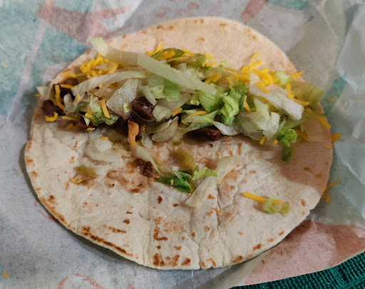 Hopped into the drivethrough line a few minutes before 1600. There was one car sitting at the (cash) payment window (seriously: why have a window just for cash payments but have credit-card users pay AT the food delivery window???), me and another car at the two, parallel order kiosks. I ordered two soft taco supreme meals - one with beans instead of ground beef the other with steak instead of ground beef - each with a water. On the menu, one showed up with the "Sup" tag while the other did not. Asked the order-taker if both were actually Supremes. She assured me they were. Both were the same price, so I shrugged and moved on. Went to the first window and, after waiting 10ish minutes for the car that was there to move on, get told by the person there "this is the cash window"(???) ...ooookaaay. Takes a further ten minutes for the car ahead of me to get done paying for and receiving her food. Get to the window, hand them my card. I say to my wife, "check the bag to make sure they made the correct meat substitutions". They eventually hand me my card back followed a minute later by our bag. Slow, but still far faster than the previous vehicle. I was momentarily happy that we'd gotten our food so quickly after such an extraordinarily long was (during not lunch or dinner rush - go figure). I pull up so next car can get complete their transactions and pause so wife can inspect the food order for correctness. She tells me the meats were correct, so I drive out of the lot. We're about a block away when wife notes that the food was cold ...presumably because it had been waiting in a bag for 10 minutes while the person ahead of us sorted out their order. Sub-ideal, but not a "turn the heck around and try to get an actually warm order" - it's Taco Bell so warm or cold isn't really going to make much difference on enjoyableness.