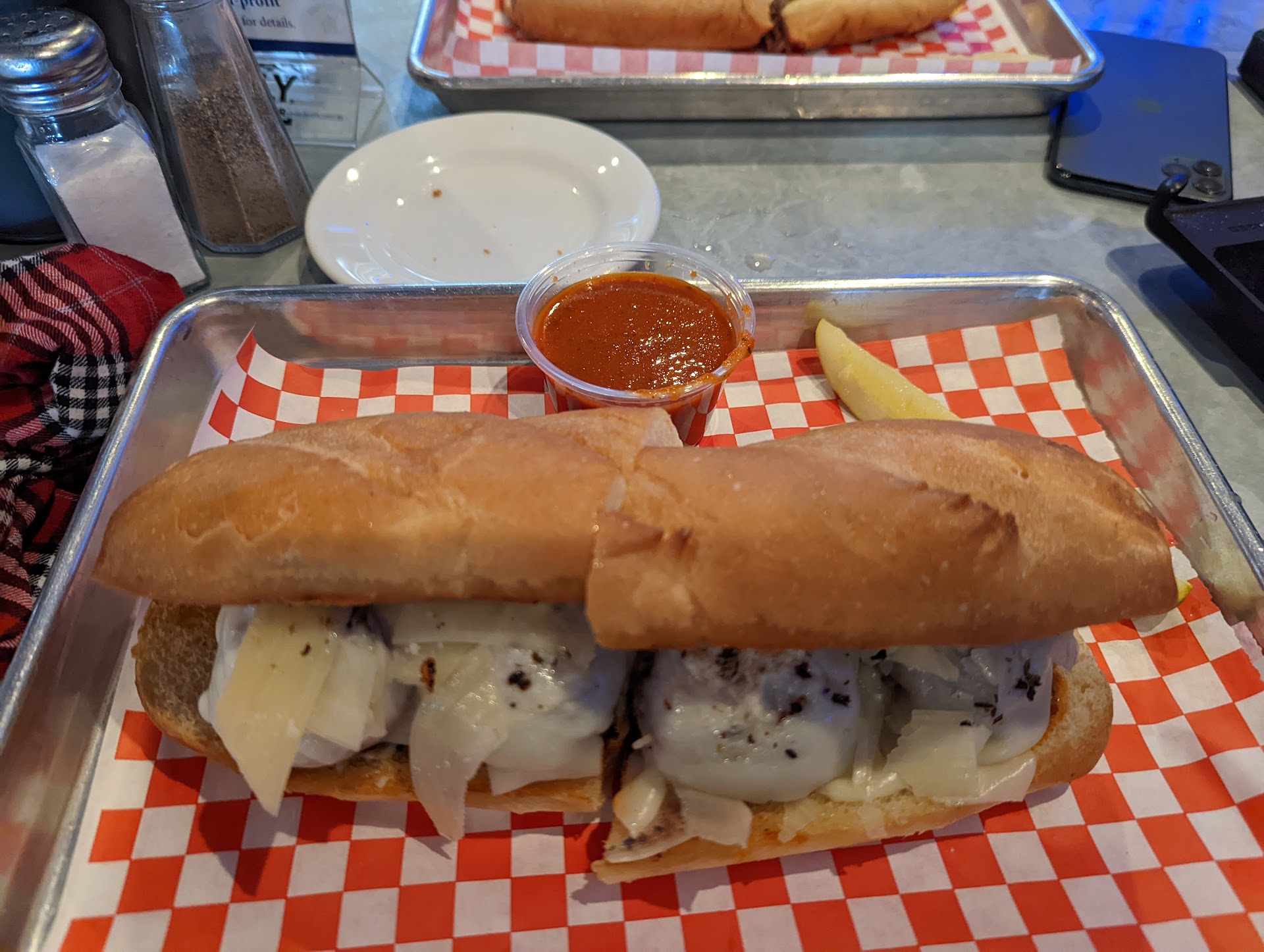 We got the Philly cheese steak sandwich and a spinach tortilla wrapped Pasadena burger. Both were great. The Philly cheese paid plenty of homage to Philadelphia. The meat was shaved and very tasty. With the marinara sauce it was like eating at Dalessandro's Steaks in Roxborough. The hamburger served as a burrito came pressed so that it held it's shape as a bit of a saucer and had nice crispy texture to the wrap. It also held up against the juices from the hamburger itself.