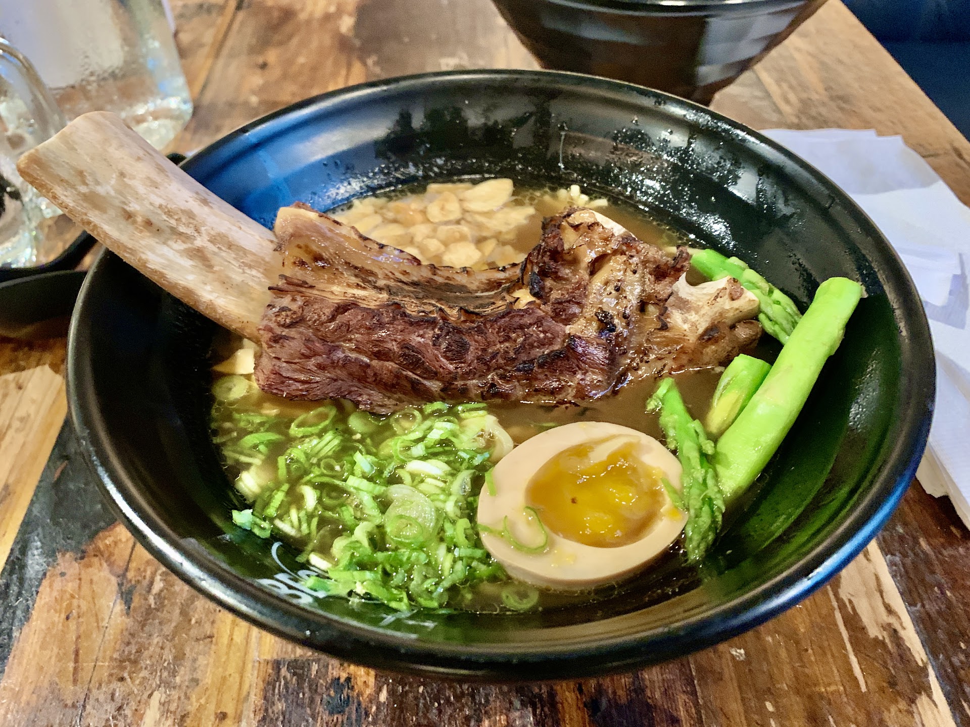 We ended up ordering the beef rib ramen because the 3 apps werenāt enough. The bone needed to be cooked a little longer cause it was chewy. The torching of the meat made no sense and took away from the beefy goodness of the beef bone. The broth was just overly salty which made it hard to enjoy the entire dish. Really like the amount of garlic they...