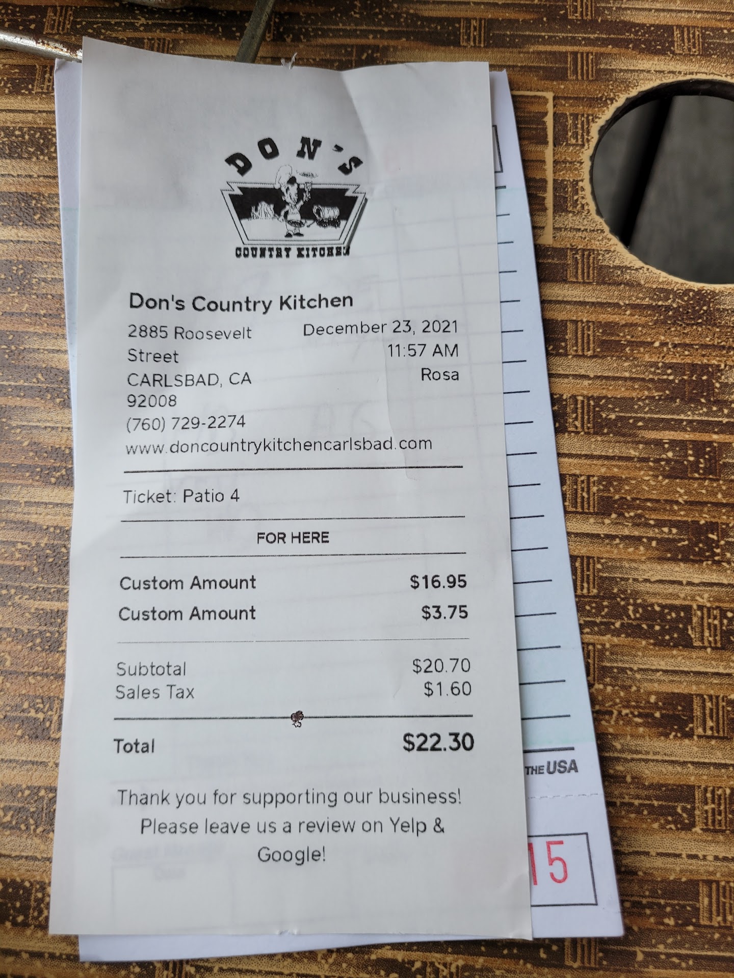 Read moreSo I've been in Carlsbad for several days working and this morning I woke up in need of breakfast and comfort food. Well check this out....Don's Country Kitchen in downtown Carlsbad. Quaint and cozy place. Feels just like sitting at home in my own kitchen. About 10-12 tables and a counter inside. 5 tables outside .....sidewalk seating. I walked in put my name on the list. Bamm!! Just like that I was told I could pick any table. I went outside and the server was right behind me. He brought me coffee and water. I ordered food. Although I didn't time it I'm sure it was out in under 5 minutes. Look at this feast of beauty!!! Food was good. Coffee good. Service was absolutely amazing. Stellar in fact. I was offered refills on coffee a couple times. Server dropped the check. Possible rain/drizzle coming. Servers offering outdoor umbrellas to the tables just in case. Server was able to put up an umbrella at one table without a hiccup (baby on board better safe than sorry!) In a nutshell....if you haven't eaten here before you should. Prices seem inline for downtown Carlsbad. Prices for quality are on the money. Don's closes at 1 pm daily. Closed on Sundays and Mondays. I feel like I just had great home-cooked meal but I don't have to clean up or do the...