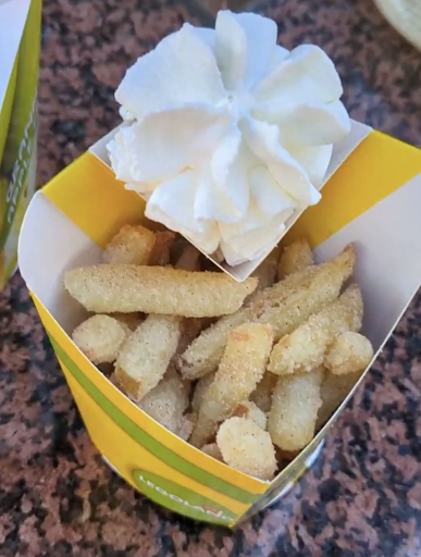 Busy dessert shack offering its namesake treat of fried apple slices served with whipped cream.