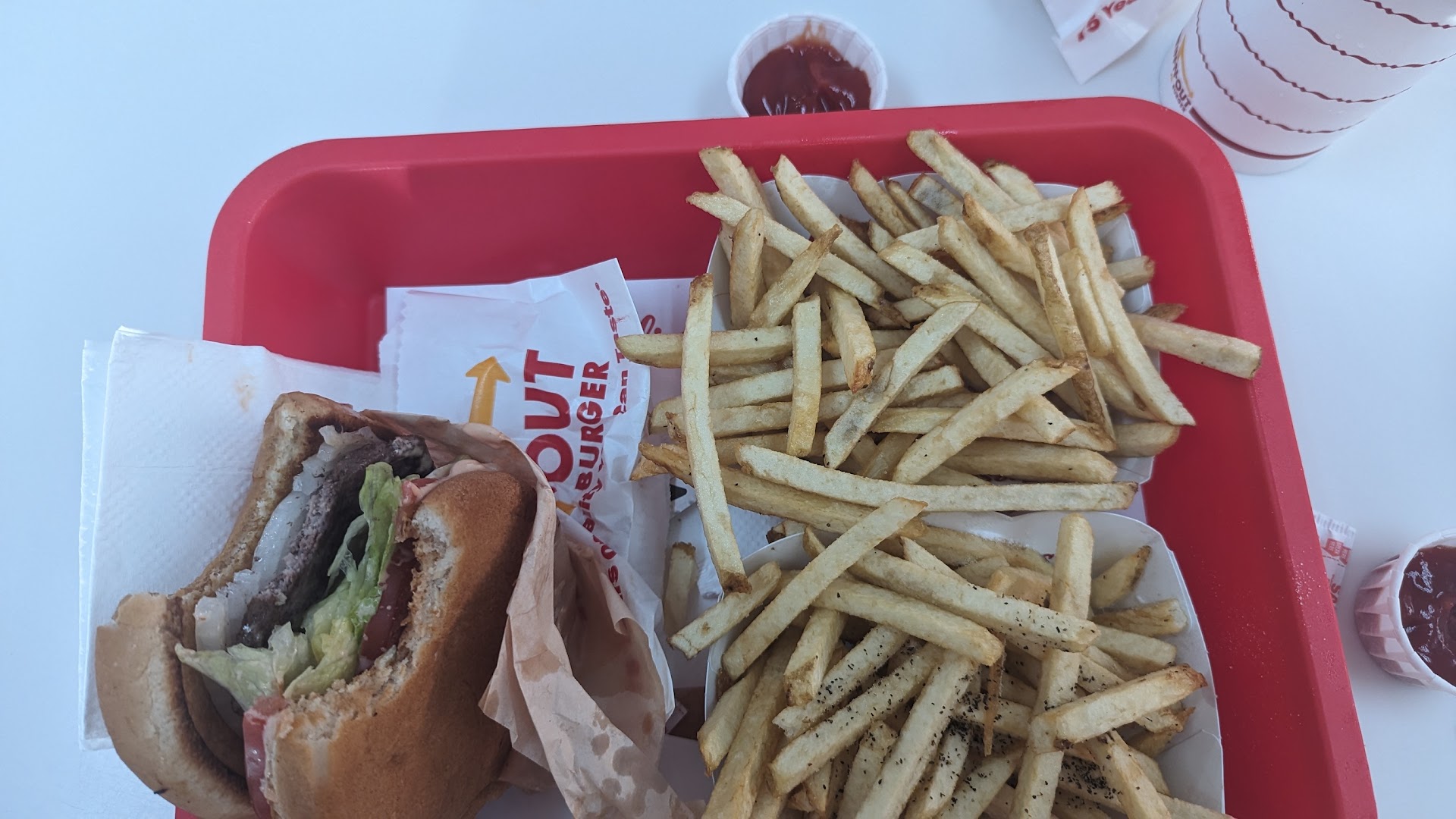 It is good for what it is...cheap. the French Fries are basically unedible, and definitely would not order a milkshake again. For a restaurant so popular, why not fix the fries? I understand they are 'fresh', but there is another popular place that also does fresh fries and is miles better than In and Out. Service is fast and friendly (not including the half hour you will wait in line between placing your order and picking it up) consistency is great. The parking lot is a bit tricky, especially when there is a line. They have some outdoor seating...with a view of the parking lot.