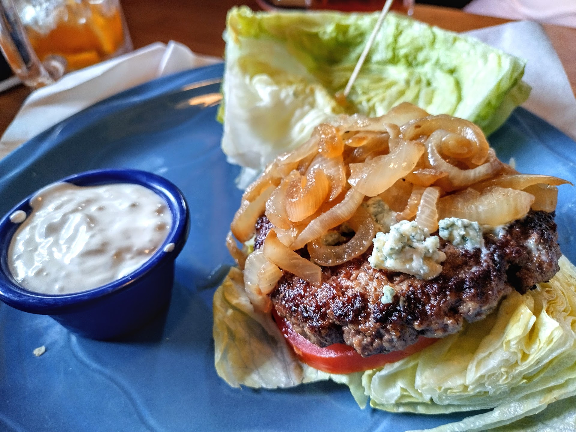 We ordered a Bleunami Burger, Lettuce-Wrapped, with Grilled Onions instead of the Red Onions that come with it. Our burger was cooked perfectly Medium-Well, just as we'd ordered it. The grilled onions were a great addition, & this burger also comes with a nice spread of chunky Bleu Cheese on it. On the plate as well, was a small container of Bleu Cheese dressing, so we could add as much as we liked, to make sure this Bleunami Burger was riding a Tidal Wave of flavor, right into our mouths.