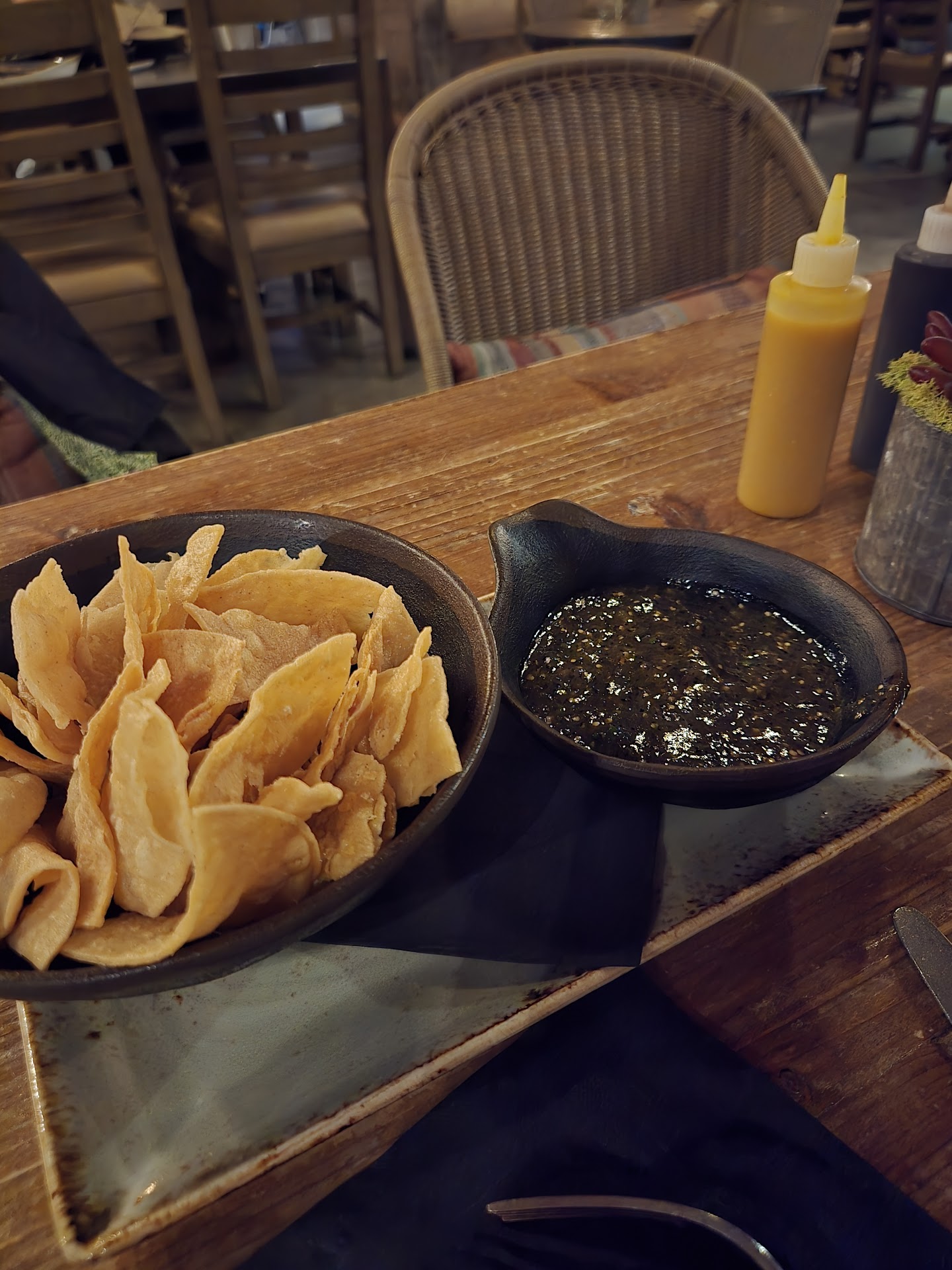 Visited on a taco Tuesday and to our delight the tacos were 3 for $14. You have to get all 3 of the same tacos which is odd but we just ordered a few kinds and shared between 4. The restaurant has great decor with a great mix of textures and tones. There is an indoor/outdoor vibe with the back half that has a motorized awning that got opened at night. On top of tacos we tried the fries, elote, beans and rice. The fries were okay, not very loaded so only the top half of them had toppings. The elote was DELICIOUS. Comes with 2 pieces so great for sharing. The rice and beans were nothing to rave about but again great for sharing.