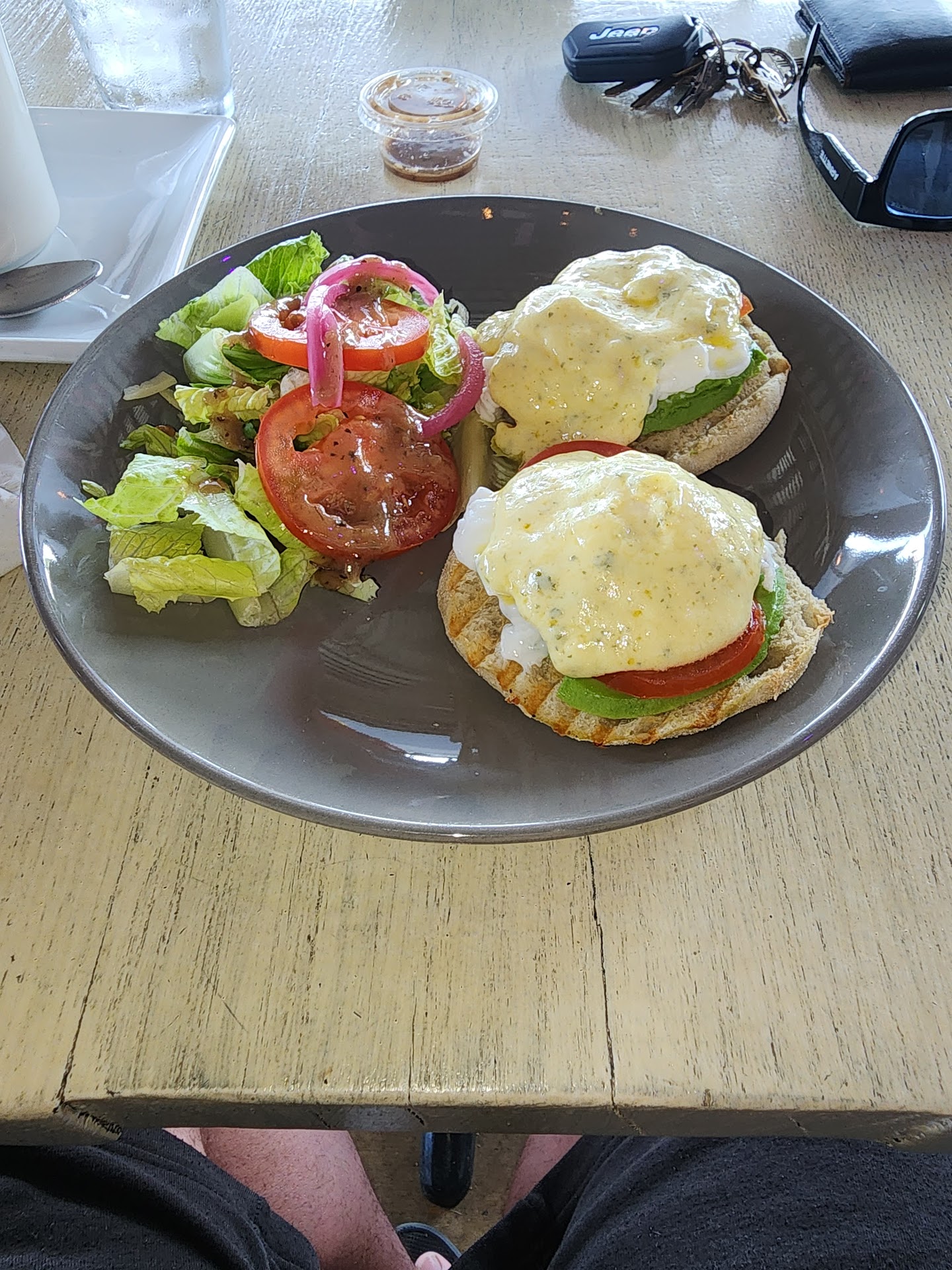 I received my drink, and the server then took my order. I chose to go with their California Benedict, which included avocado and tomatoes versus ham. I chose to get a salad instead of breakfast potatoes. The menu said fruit came with the dish, but there was no fruit when my food arrived. The benedict was great. The hollandaise sauce was house made, and the food was tasty.