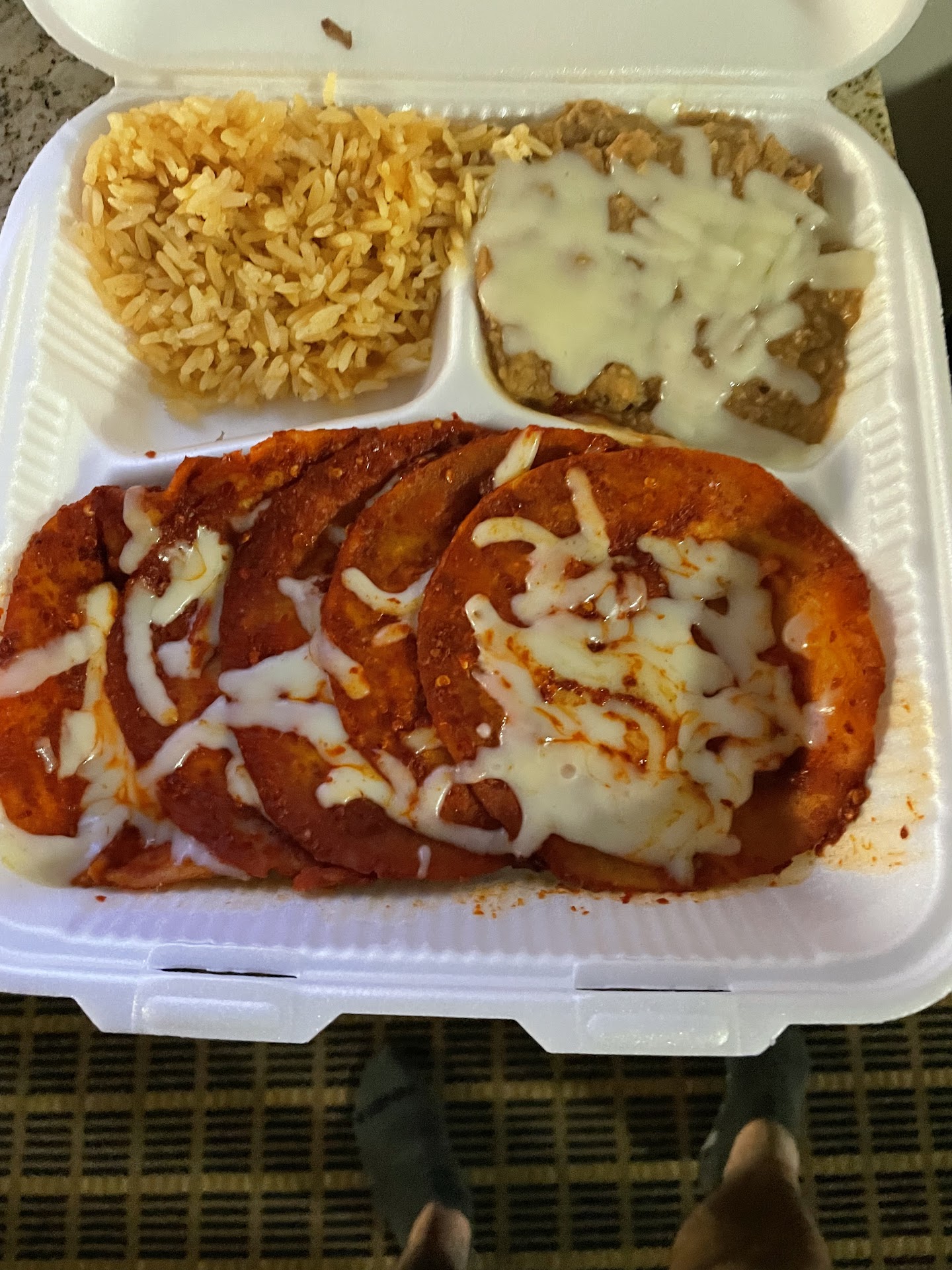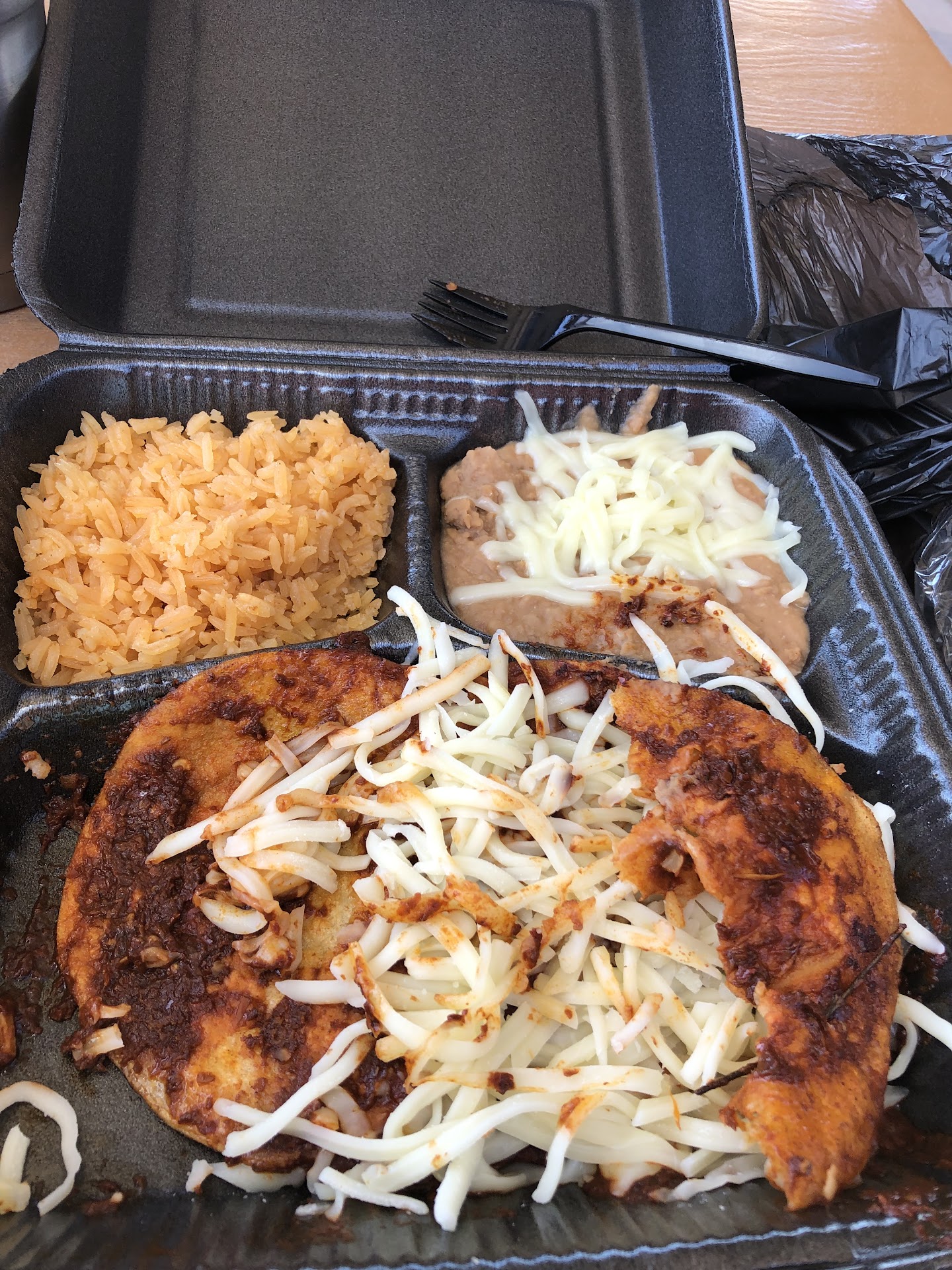 Literally everything in the to-go box was delicious, the chunks of pork were fried to perfection, the rice tasted so good I finished it and I almost never do, and the refried beans had so much flavor.