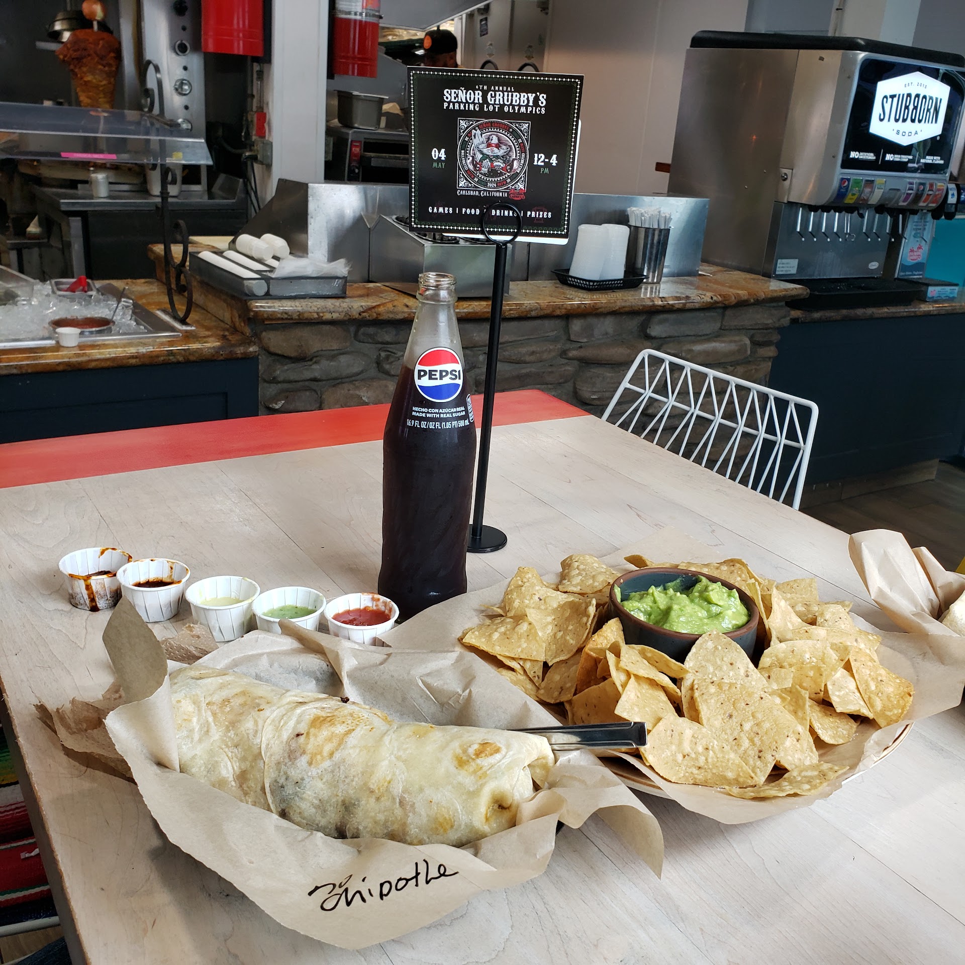 Read moreI met a friend for lunch. It was in a place between our places. She's in San Diego, and I'm in Laguna Beach. The name sounded cute, and we both like Mexican food. Nancy welcomed us with a great smile and was very patient with us. When we mentioned it was our first time, she made some great suggestions: the Shrimp Diabla and the Fish. We both chose the Pollo Asado, Hormone-Free Chicken with lettuce, pico de gallo, black beans, and our chipotle cream sauce. I don't do dairy, so I left the sauce out. One of my favorite things is a salsa bar, and theirs is stocked, so we picked the table right next to it. Oh, and they have bottled Pepsi; you don't see that often. I was not going to eat the whole burrito; I wanted to take some home—really! I ate the entire thing, with all the salsas and plenty of chips. The guacamole was good, but I would doctor it up a bit. I like spicy guac. I would return and try other menu items, such as the Birria, Pastor, and Ceviche. By the way, there is limited parking space behind the building, along the street, or at a parking lot around the corner. There is also a patio for those lovely, sunny SoCal days. You order at the counter, and they'll bring the food to your table. Enjoy the...