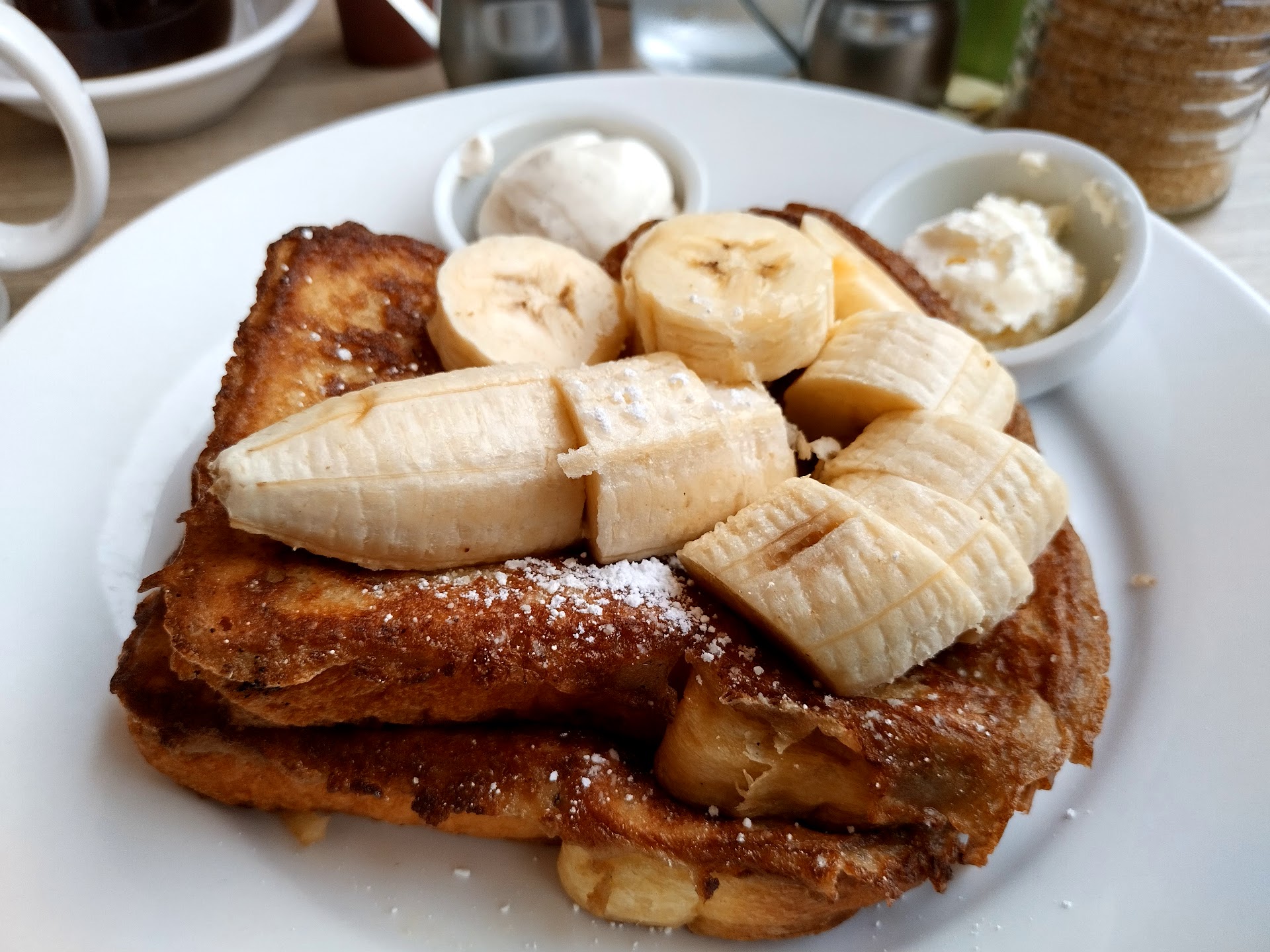 My wife ordered the Vanilla Bean Tahitian French Toast, plus added Bananas. This came with Chantilly Cream. She loved it! Thick french toast was coated in a light fluffy egg batter, and griddled to perfection. The Chantilly Cream & bananas took it to another level of delish!