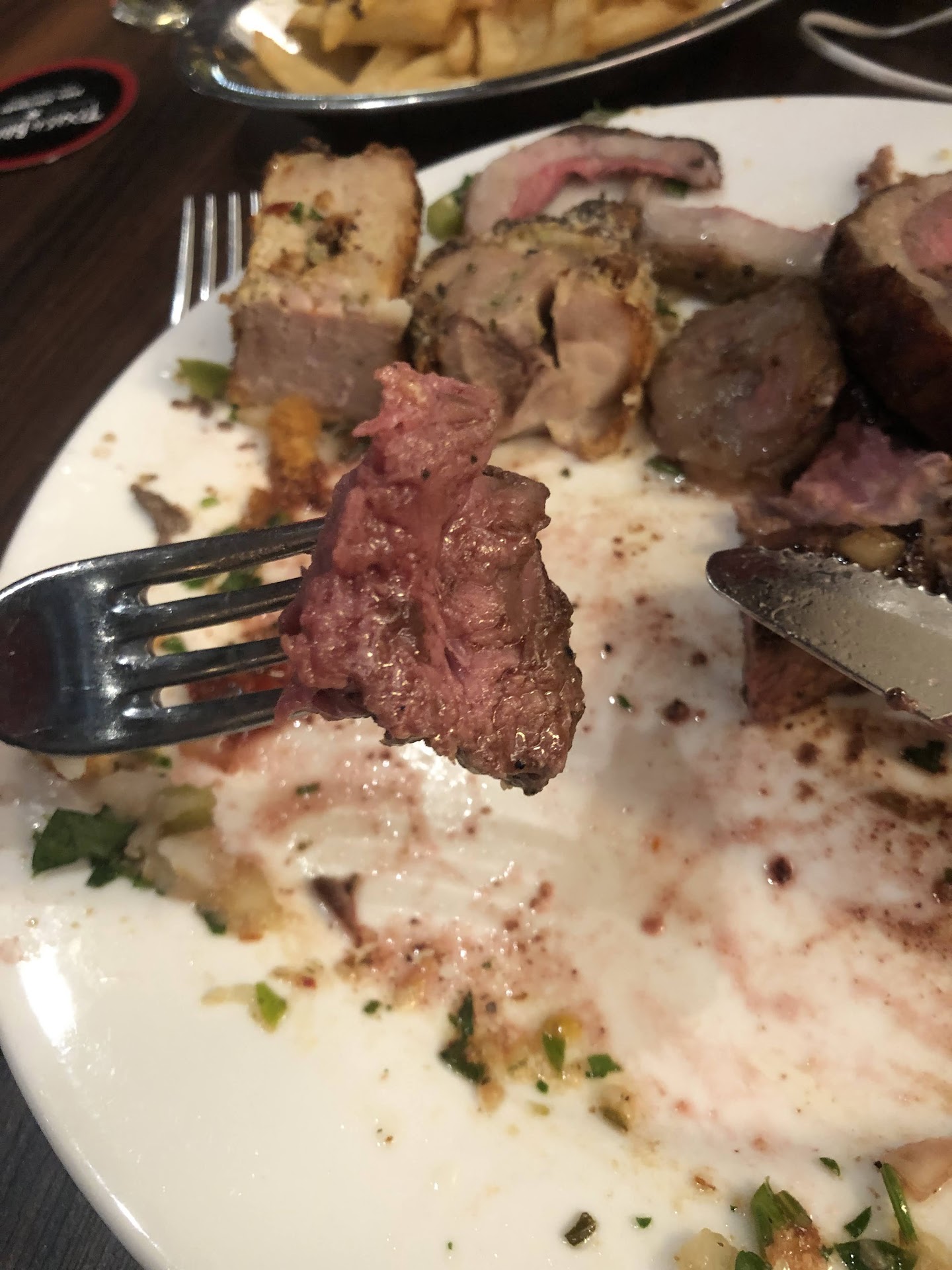 Parmesan Chicken: dry and tough. likely overcooked. flavor was lost Pork: dry and tough, no real flavor Lamb: good flavor but a little dry Filet mignon: outstanding. Great flavor, cooked perfectly, very juicy, not too tough brazilian sausage: excellent, great savory flavor, not too dry, beef ribs: great flavor, falls apart easily, cooked perfectly flank steak: very good, tender, juicy, cooked perfectly, interesting spices spicy sirloin: good, not great. Spice flavor wasn't there, meat a little tough