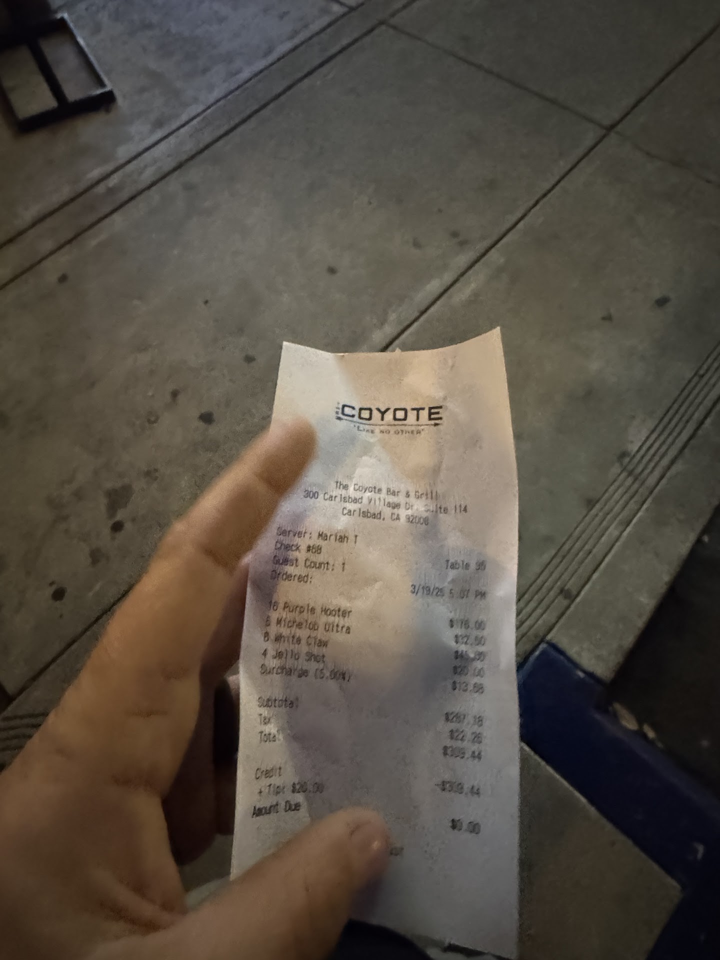 Went to coyote for the second time this week. Spent over 600$ on Sunday night with no issues and even tipped the waitress over 75$ because we had a great time and she was kind and respectful. Last night we had the unfortunate experience of having a thief (Mariah T) as our waitress. She told us we would have to leave due to the drinks listed on receipt below being more than “we could handle”. Which we thought was hilarious due to the fact that we were just there the other day and had 0 issues so we respectfully told her and her manager if we are getting kicked out we will spend our money elsewhere and tip where it is deserved. Well Mariah went ahead and tipped herself when we specifically told her not to. So as I leave I go back up to front and ask to speak with a manager. We get James, he says one word to me then walks away telling me to leave. Leaving me to talk to security. I would stay FAR away from this bar! They will take advantage of you if they think you are drunk. The video of James walking away should speak for itself. Any reputable business should refund a charge that was not approved. Apparently the coyote is far from a reputable establishment!!! And if you see I’m video not only is manager a joke, look at the security guard 😂😂😂😂