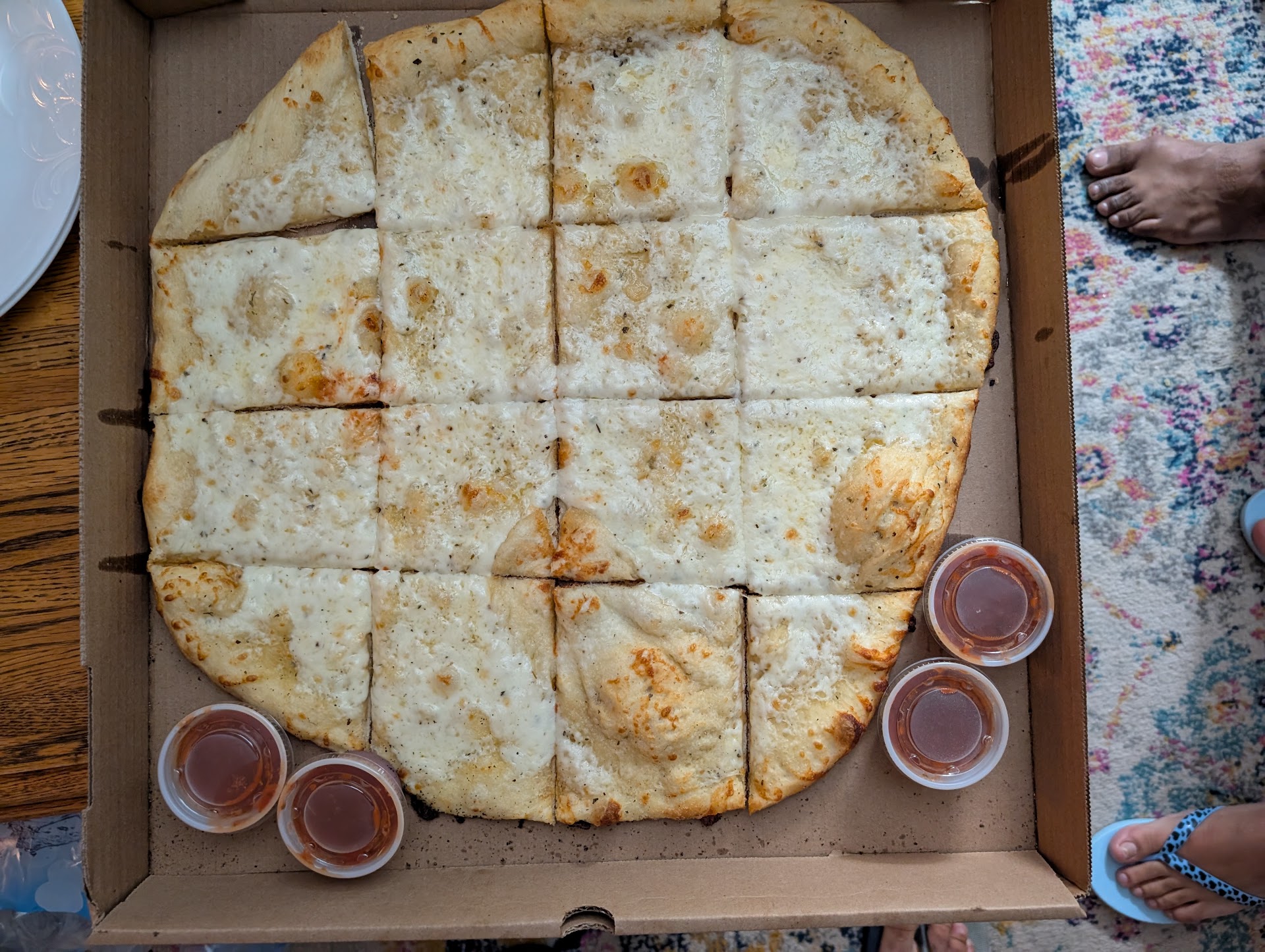Read moreLarge 18 inch pizza! There was no vegetarian pizza on the menu, we ordered a "make your own" pizza with the different veggies toppings and cheese. It was delicious. The cheese bread was good, not great. It had a somewhat overbaked crust.