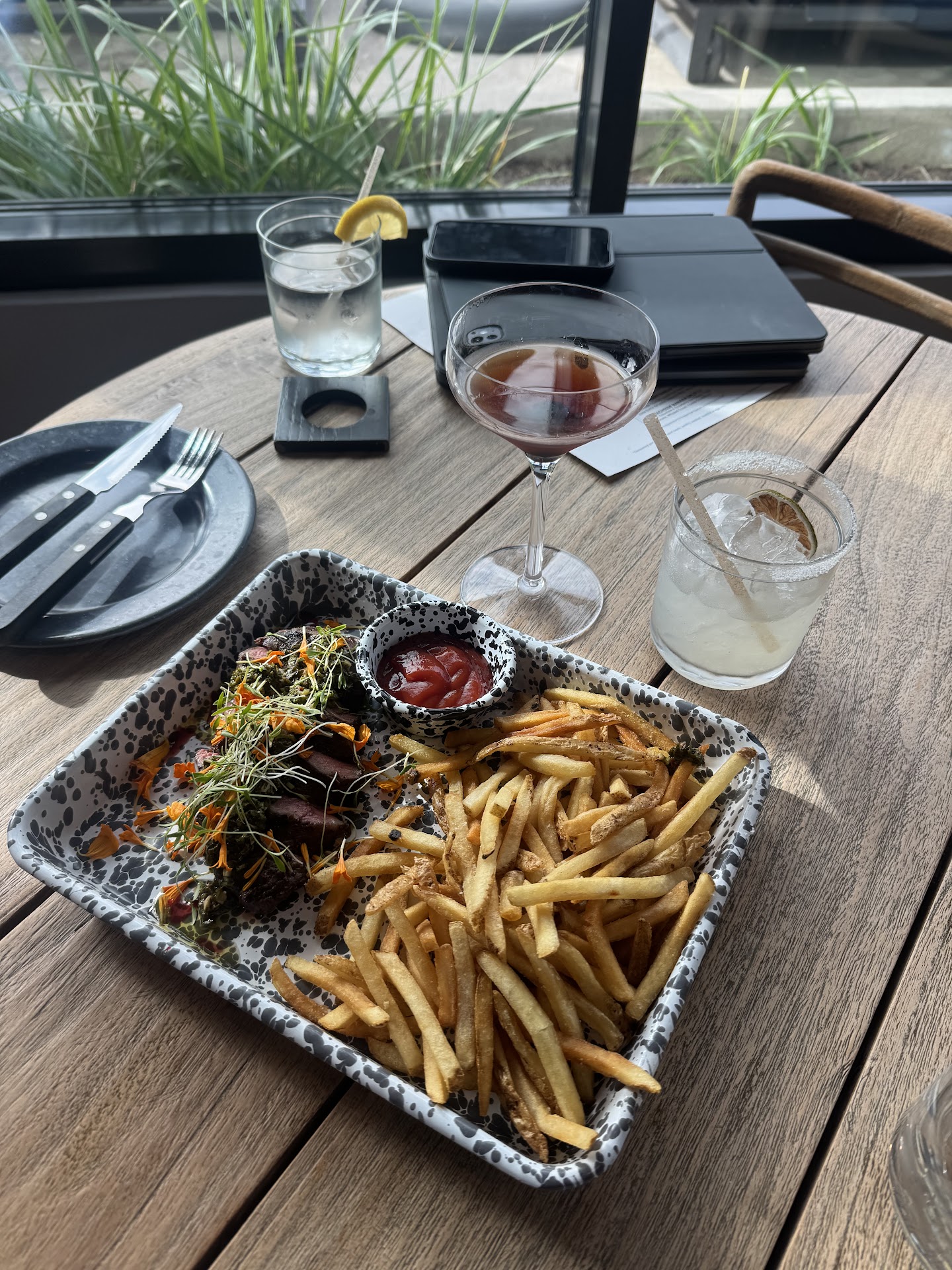 As for the food, it was just okay. I ordered the steak frites, but unfortunately, the steak was very tough and hard to eat. The chimichurri sauce didn't do much to elevate the dish either—in my opinion, it had an overpowering taste of vinegar. On the plus side, the cocktails were decent, though not outstanding.