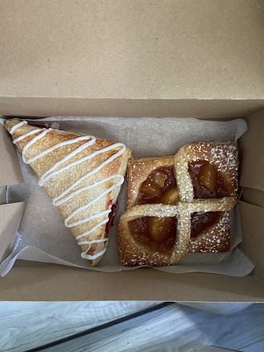 One way direction parking lot appropriate for traffic flow. Well maintained modern building interior and exterior. Service quick and polite. Had decadent cinnamon roll as good or better than Cinnabon. Cherry turnover flaky buttery. Apple fritter appropriately sweet. Seating area several customers working on their pc’s. Visited early afternoon on a day when open late (some days only open to 2 pm) and seemed low on stock and variety in display case. Highly recommend, would visit again. Wish my hometown had a bakery and store like this, good to bring friends and relatives, very...