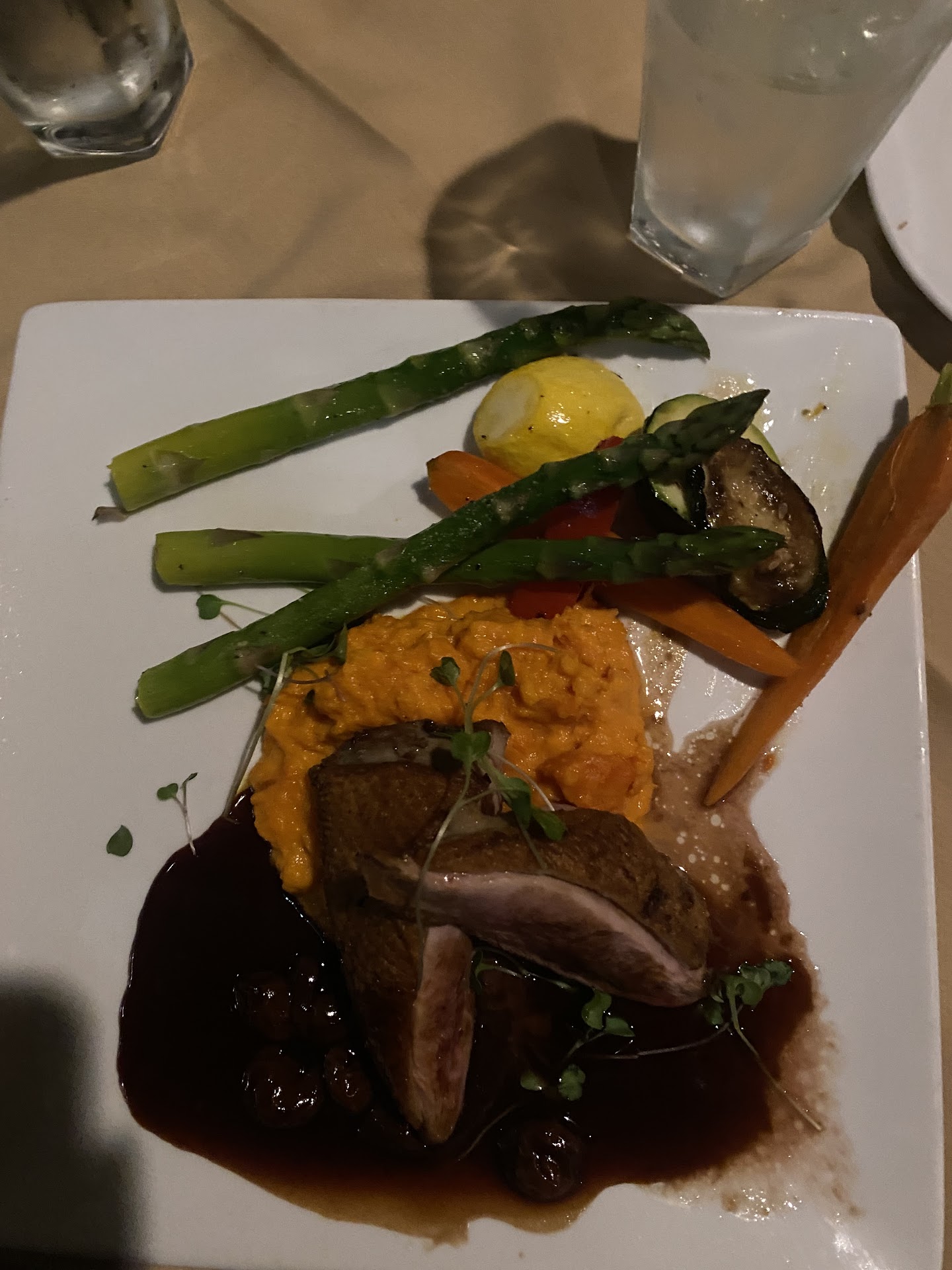 Read moreThere is a nice pool and fountain on the outside and on the inside there’s a nice fireplace and a super cool sliding bathroom door. After reading the reviews I was really excited to be going with my boyfriend to give this place a try. However, our experience wasn’t great. When we arrived for our reservation, we couldn’t find the door then when we did find the door we saw this guy with a suit standing outside. My boyfriend greeted him and he ignored us. Then when we were about to open the door he gave us a judge mental look as he approached us. He asked if we needed help. I said we had a reservation for 9. That’s when he began scolding us and saying that they gave us a call and that they close at 9. I don’t answer calls from unknown numbers and when they texted me at 8, We were driving there because we live far away. Anyways, because of that first interaction we felt unwelcomed, as if we were being a bother. It is not our fault that we thought our reservation for 9 would be ready at 9. That is an issue with their website that needs fixing and for him to try to push the blame on to us was unprofessional and unkind. I felt uneasy and at that time wanted to leave however, I heard great things about the duck and wanted to give it a chance. Our kind waiter brought us the duck, and as I tried to eat it, I began to taste the salty tears I’d been holding back. To me the duck wasn’t great, but in all fairness it could’ve been ruined by that. I admit that I think this place has potential, and for many people it is a great place. So who knows maybe you’ll like it. However from my personal experience, I...