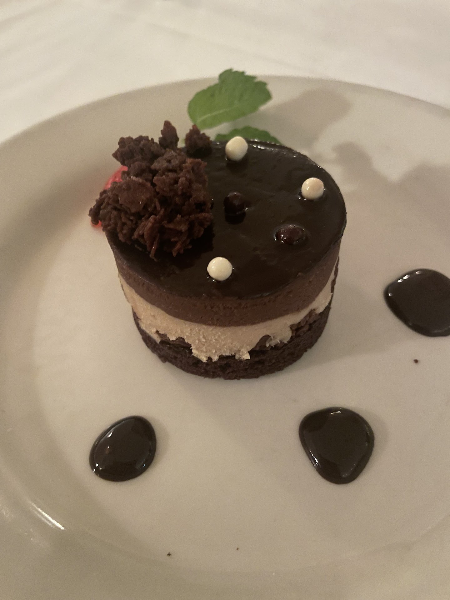 Dessert I had gotten a small chocolate cake with hazelnut. The hazelnut flavor was nonexistent. This was disappointing.