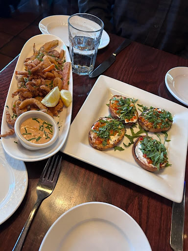 We sat up top on the open-air deck for appetizers and wine. It was quite a lively scene for a Monday night. The upper deck has a number of firepits and heaters to keep everyone warm. We enjoyed a glass of house Cab each and ordered a couple of appetizers: Truffled Gnocchi and Calamari Fritti. The Gnocchi was baked in a flavorful sauce with truffle oil and parmigiano. The calamari consisted of tubes and tentacles and came with flavorful chipotle aioli dip. My wife ordered the crab bisque soup which we also shared. Service was a bit spotty but the food...