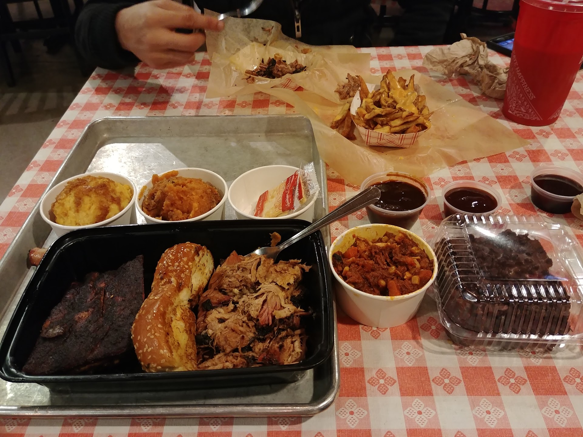 Read moreHad a terrible bbq experience here, first off there were only two people in line in front of me (6pm) but it took 10 minutes to get up to the register because the kid who was taking orders was so slow and seemed new, plus nobody was helping him. After I finally ordered I waited 22 minutes for my food because there was only one other kid in the back making the food and putting things together. There were four other teenagers on the front line just pacing around trying to look busy, wiping things down etc. and the manager lady was off to the side sorting through some scraps on a table and not paying attention to them at all. Eventually she poked her head around the corner and asked if the cook was doing alright to which he replied “I’m just trying to get caught up” so she started to help him a little bit but had no sense of urgency or really seemed to know what she was doing either. Eventually they put most of my food on the front counter but they were still waiting another 5 minutes for fries so by the time I got it I had to ask them to reheat it because it was now room temperature. What a joke. They weren’t even busy and there were less than 10 people in the restaurant on a Monday night. Paid $25 for warm BBQ and waited half an hour from when I walked in the door to what is supposed to be faster than a sit...