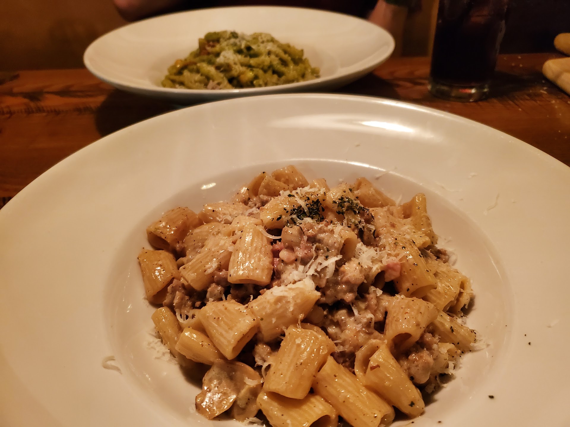 Our son ordered their Fish Special [$38] for the evening, which was Swordfish with asparagus and potatoes. The fish looked to be cooked through well and the meal seemed to be decent portions. He indicated he enjoyed all of it. My wife and I each ordered the Pansotti [$21], tortelloni stuffed with parmigiano, spinach, swiss chard and ricota covered in a gorgonzola cream sauce. The filling and sauce tasted good, but the pasta on the exterior of the tortelloni was on the thicker side and definitely did not seem properly prepared as it was tough to cut with a fork and even a bit to chew.