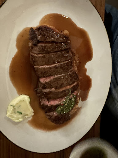 For mains, we had the steak au poivre (8 oz strip, med. rare, cooked perfectly and sliced so it was both easier to eat and confirmed to be perfect before serving - love it!) and the Icelandic cod, as well as a flight of all their sauces. The chimichurri, Old Bay beurre blanc, smoked horseradish and black garlic aioli were all standouts. The au poivre had a beautiful texture but could’ve had a bit more pepper for my palate, and the Lone Pine red wine demiglace was delicious but not my usual speed. The fries were excellent - crispy, well-seasoned and just thick enough.