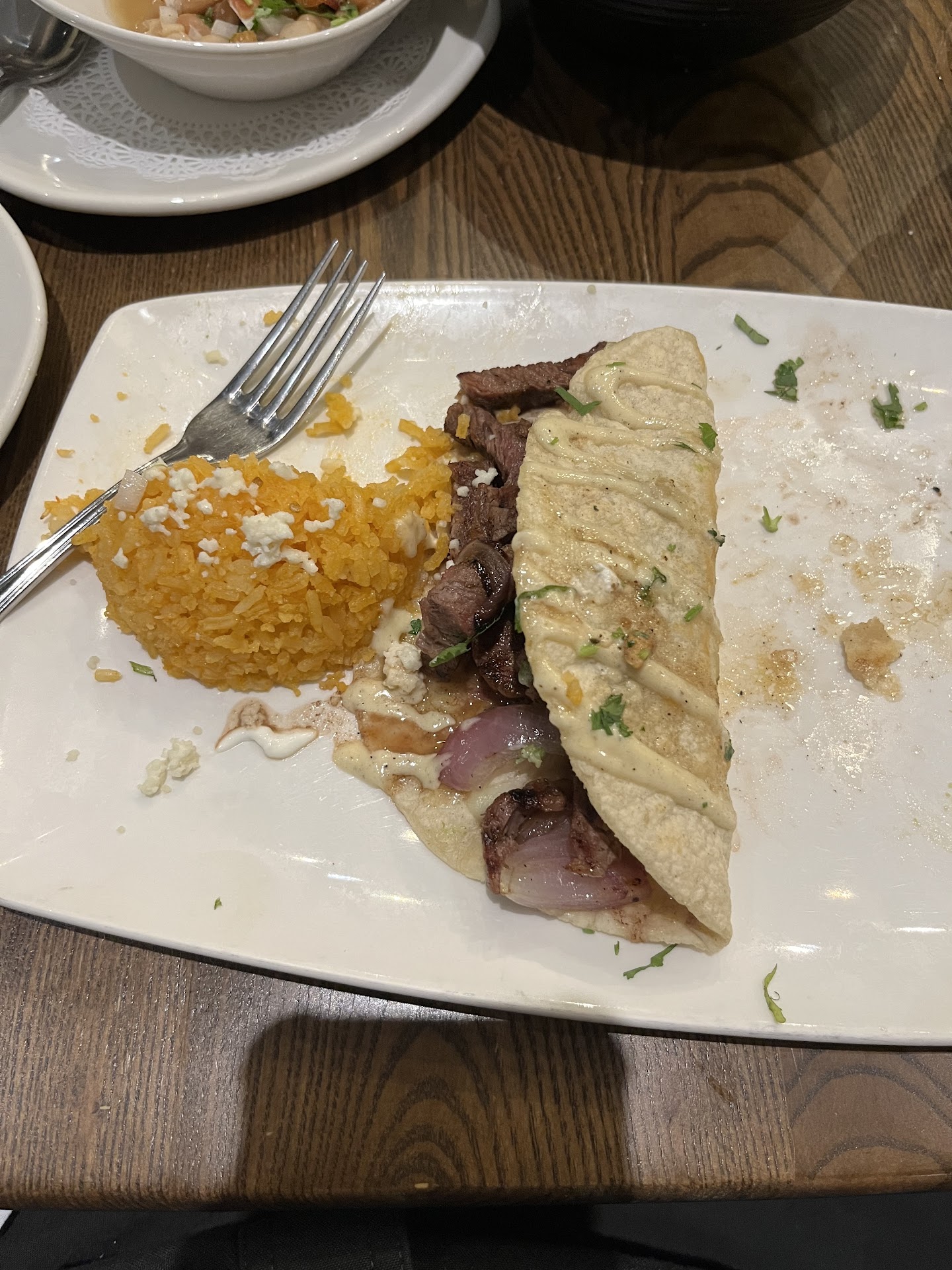 Never had sopes before, but very much enjoyed them. Seemed like a thicker fresh tortilla for a base with a blend of veggies, salsa, and cheese on top. Would consider ordering them again. Rice on side was OK. Wife did chile relleno, which was tasty and well prepared. She said she would definitely order it again. Liked her sides of rice and black beans, but thought the black beans were better. She also had a skinny spicy margarita, but said she would not get it again. Thought it tasted fine, but was primarily ice and not worth its price tag.