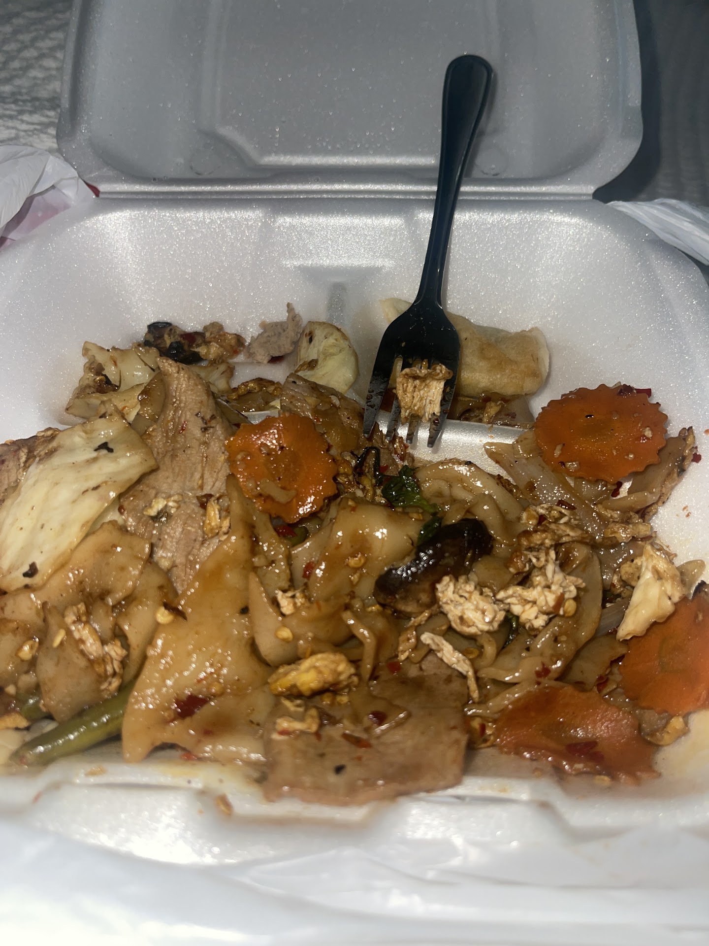 I have eaten here several times and have enjoyed the food. Service has been lacking in the past, but they have always been very nice. Tonight my future father in law was in town from NY and he wanted Thai. Waitress was very sweet, but over the top nervous and almost scared acting. We noticed all of the wait staff acted this way! Was very strange. We ordered satay and calamari. Satay came out in good time and tasted great. We asked repeatedly about calamari and we never did receive it. She brought my meal out and not my fiancé’s or his fathers, after several minutes they told me to start eating so my food wouldn’t get cold. I had a chicken with peanut sauce dish and veggies. Was very good....until the third bite when I bite down on a shrimp tail! After digging around and finding three more shrimp tails, I about threw up. I have had several shrimp dishes here in the past and I’ve always had shrimp tail served on my shrimp. So of course the first thing that came to my mind is/was, that I was eating someone else’s discarded shrimp tails!!! As if that’s not gross/bad enough, won’t if I had a seafood allergy?! We immediately left and they had the audacity to charge my fiancé for the three beers we had and the satay. We went across the street to Bub’s and talked about our experience and it got my fiancé all fired up. He went back over to the restaurant and they did give him his money back. I will never eat here again and I want to make a complaint to the health department. Very disappointing because we love Thai food and the location is right down the street from our home. By the way, Bub’s was...